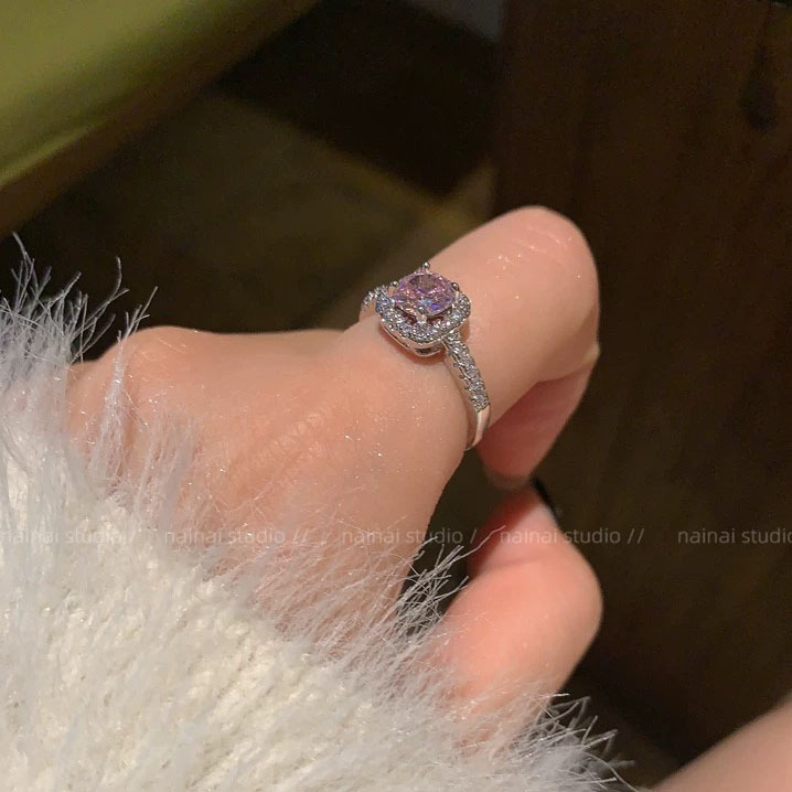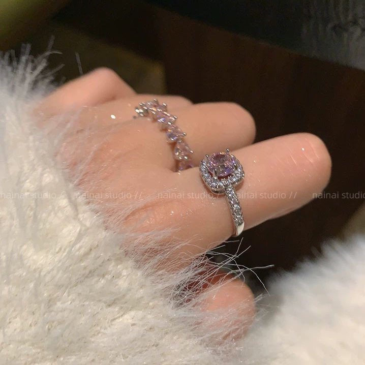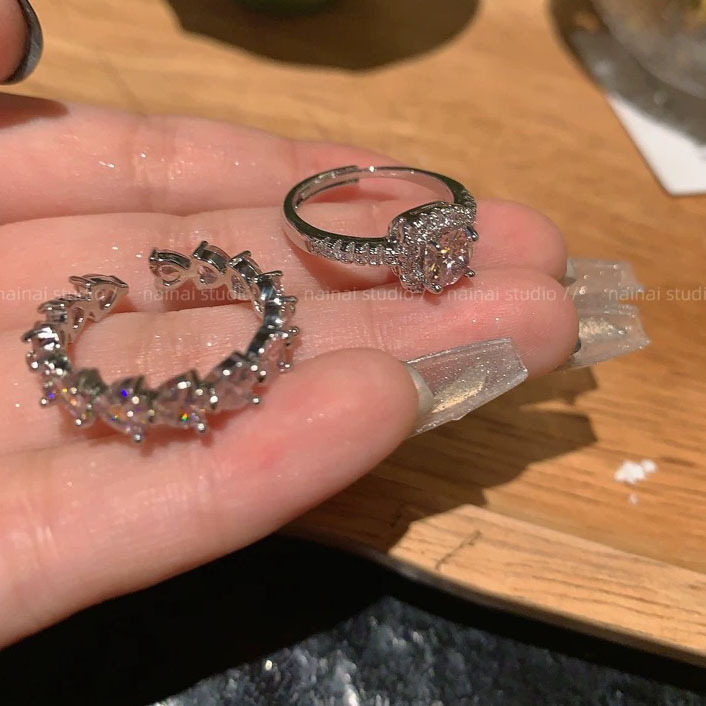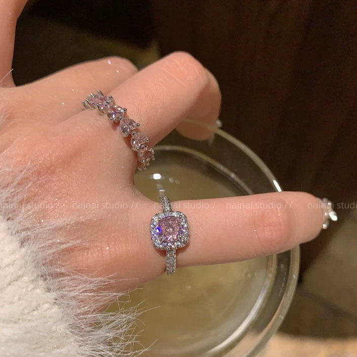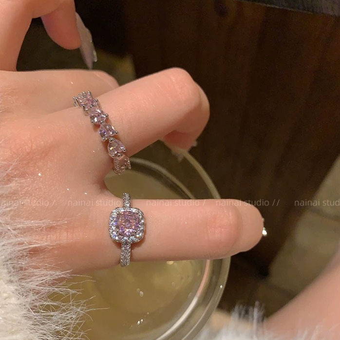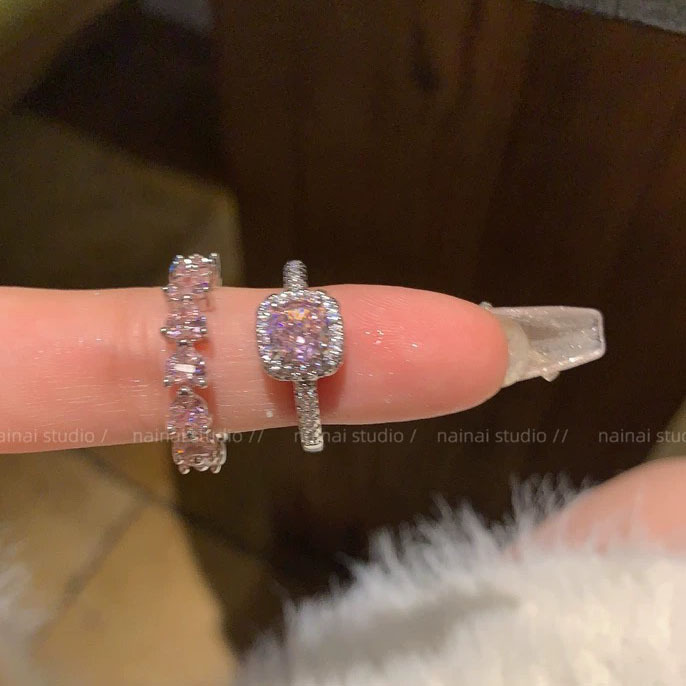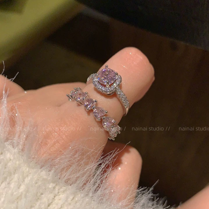 Super Flash Pink Ring ~ Zircon Diamond High-grade Light Luxury Open Finger Ring Row Diamond Love Stacked Ring Women