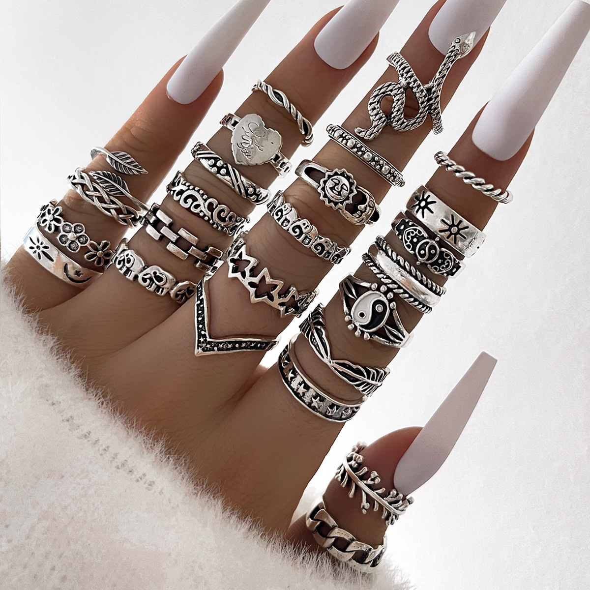 • 产品名称:欧美时尚25件套戒指 蛇大象滴油八卦爱心树叶小花几何关节戒指女