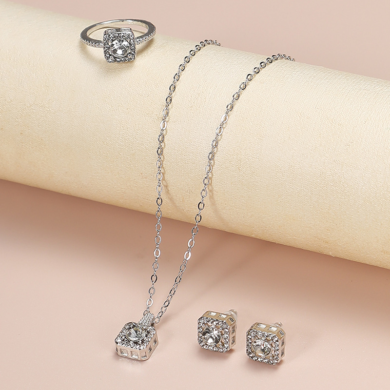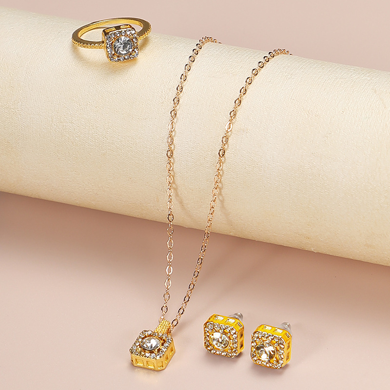 Color: Rounded square earrings, pendant and ring three-piece set, gold