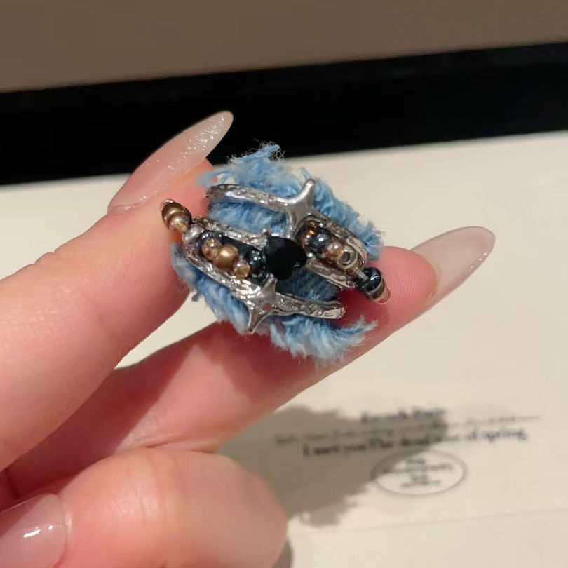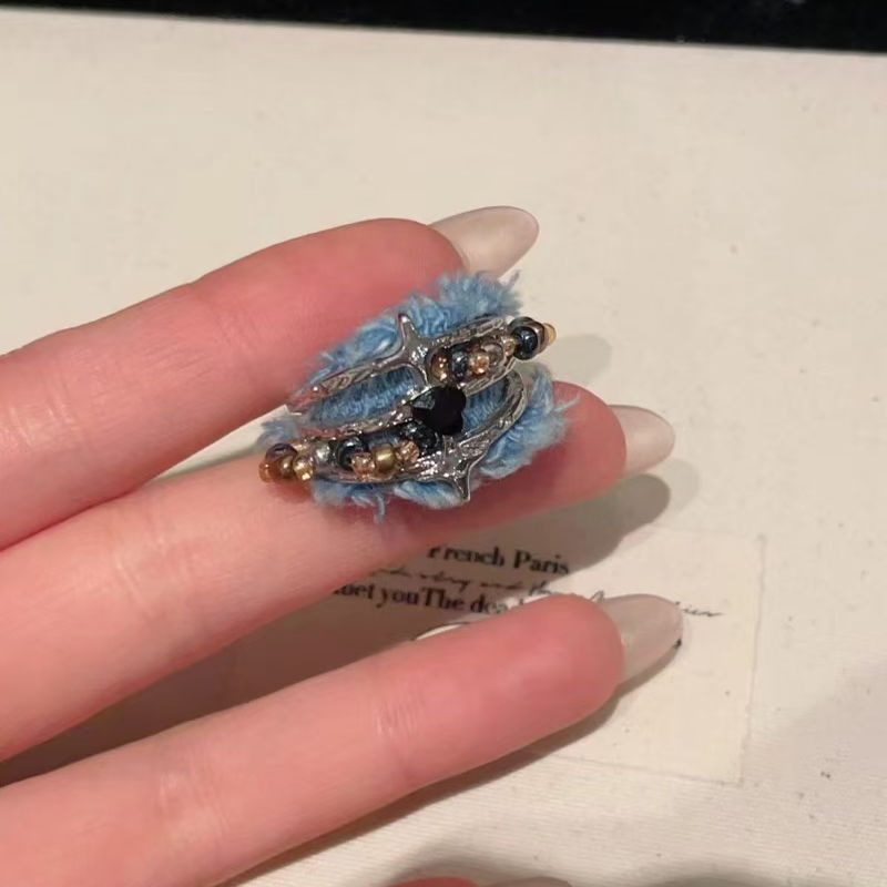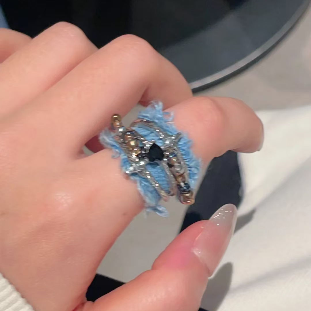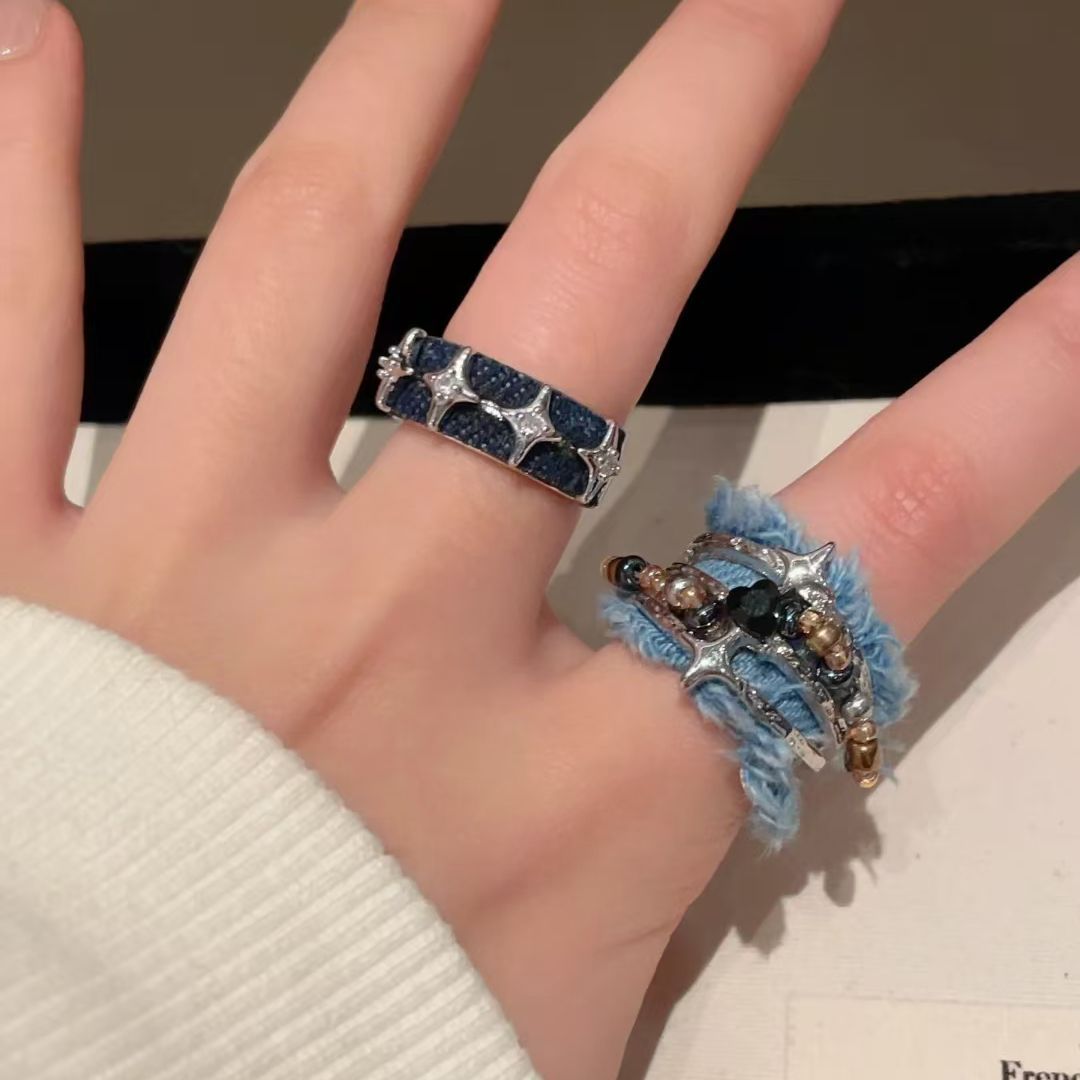 2024 New Four Mans Star Denim Beaded Open Ring Women's Vintage American Style Trendy Cool Hot Girl Personalized Ring