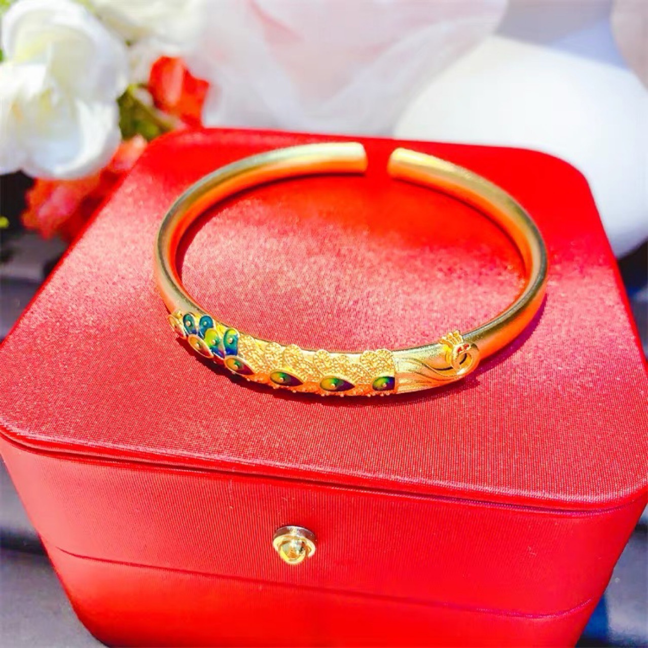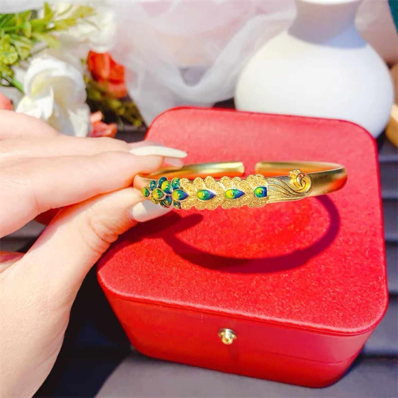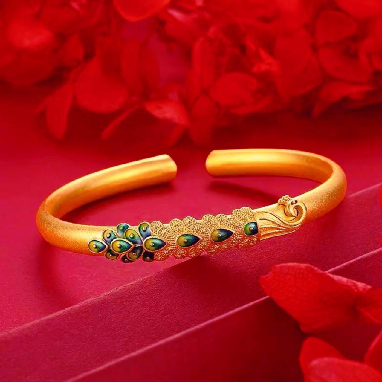 Ancient French Gold Burned Blue Peacock Bracelet Chinese Style Brass Gold Plated Solid Open Bracelet Women's Live Studio Supply