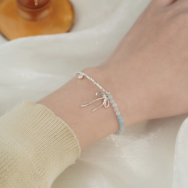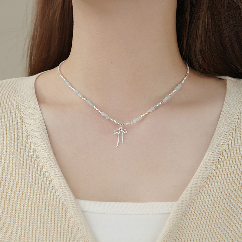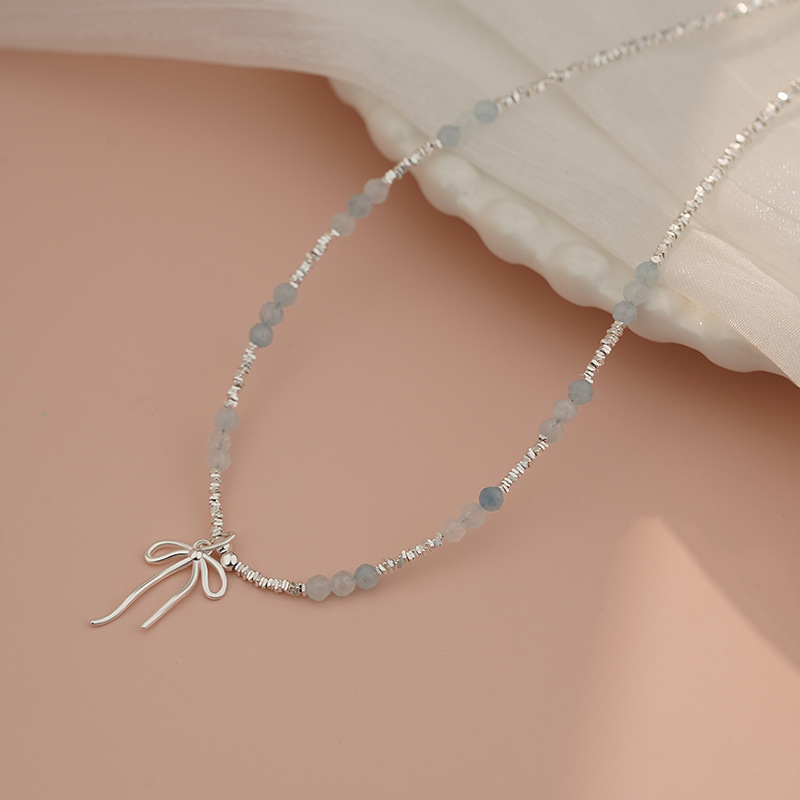 Ganjia S925 Sterling Silver Bow Broken Silver Aquamaro Necklace Sweet and Fresh suit High-grade Jewelry for Hair