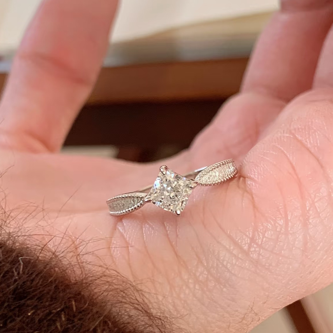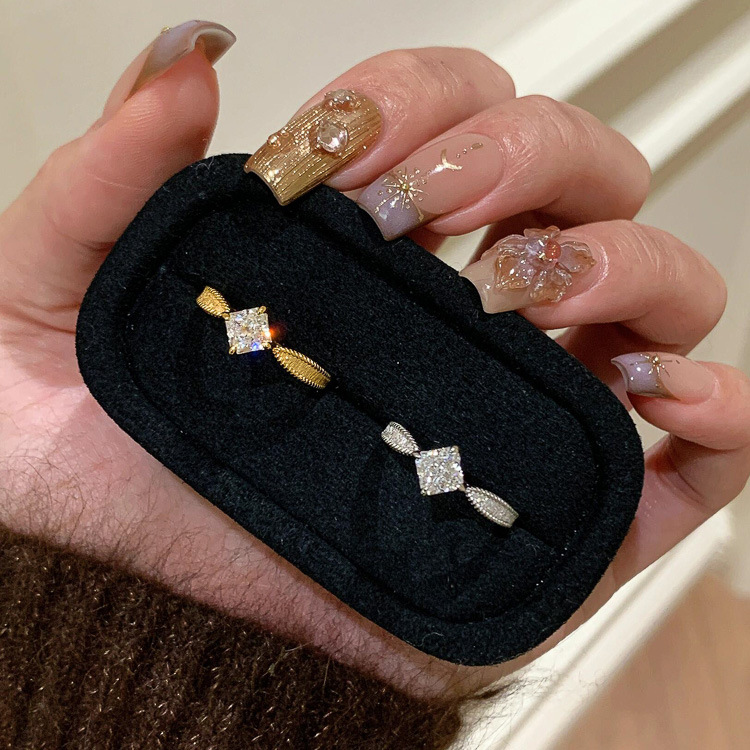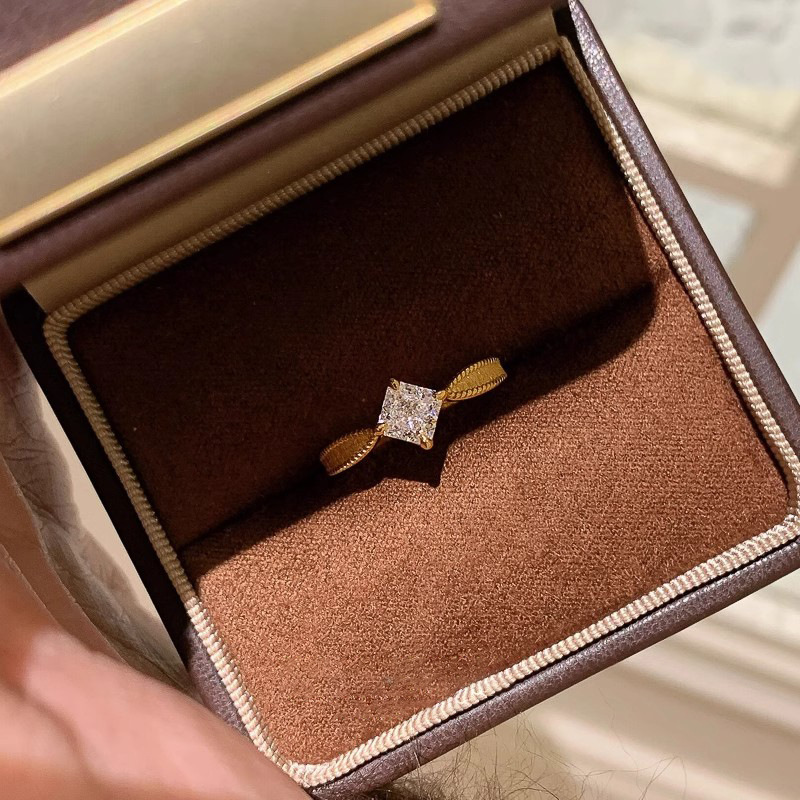 Little Red Book Ancient Method Wire-drawing Single Diamond Ring Women's Vintage Middle Ancient Plain Ring Light Luxury High-end Sense Square Diamond Ring