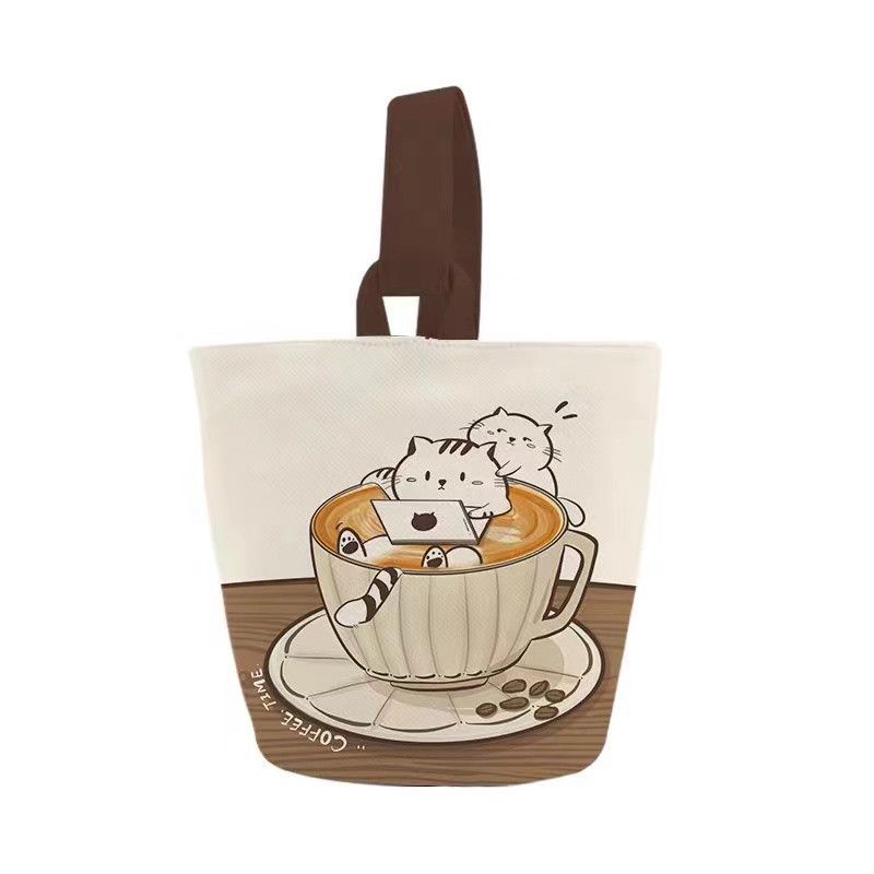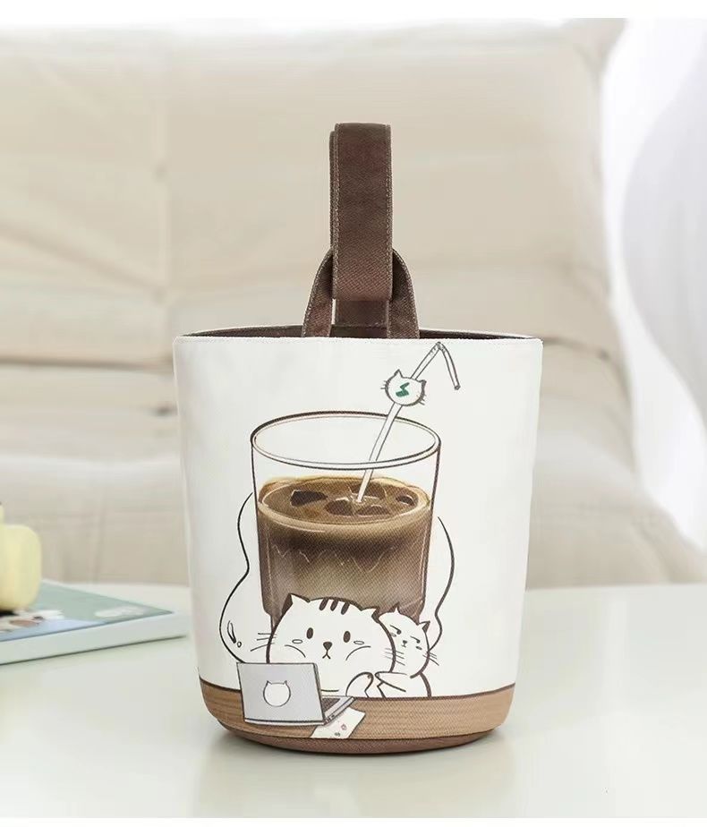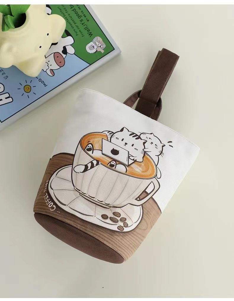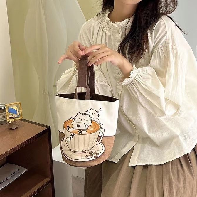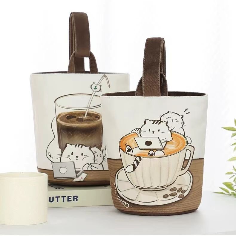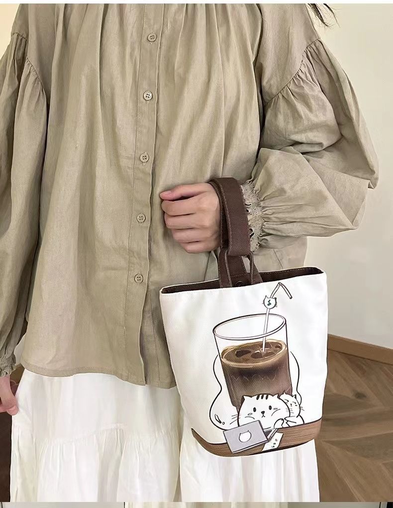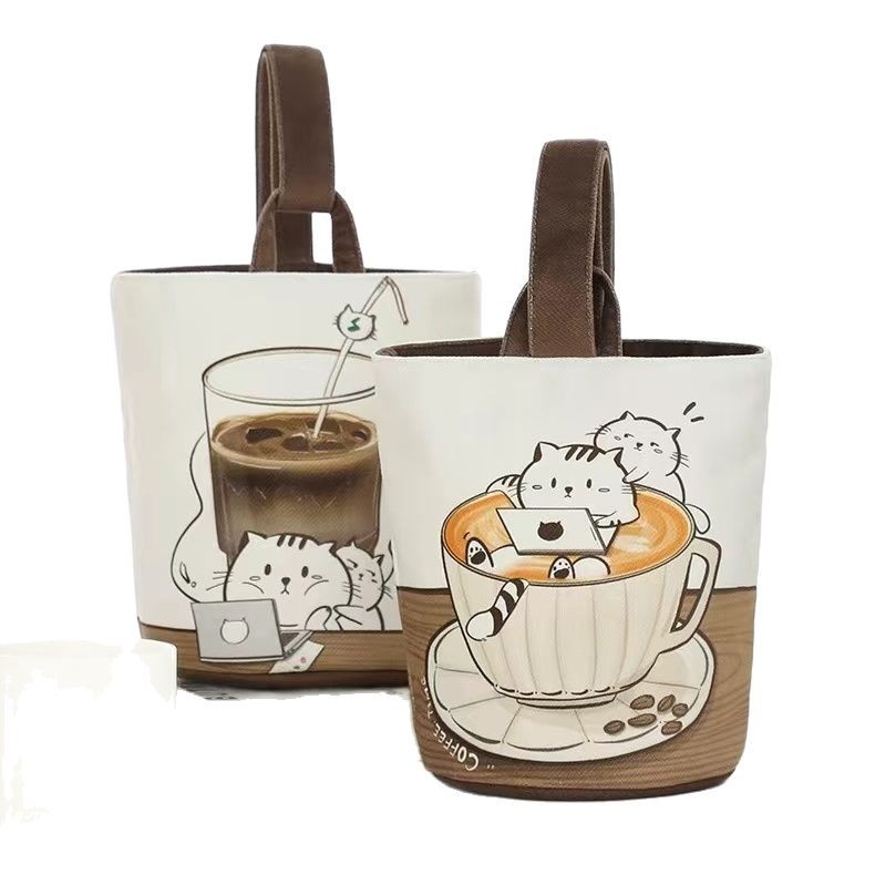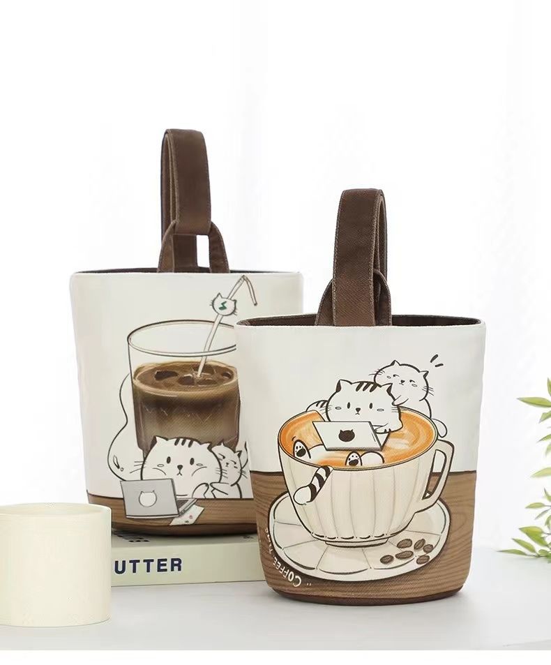 Cute Coffee Cat Portable Mummy Canvas Bag Shopping Student Cute Bucket Hand Lunch Box Handbag for Women