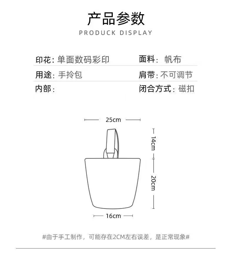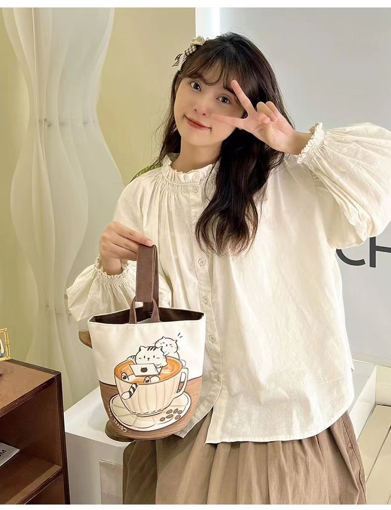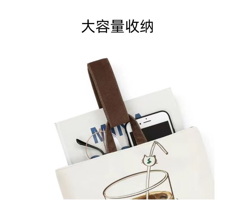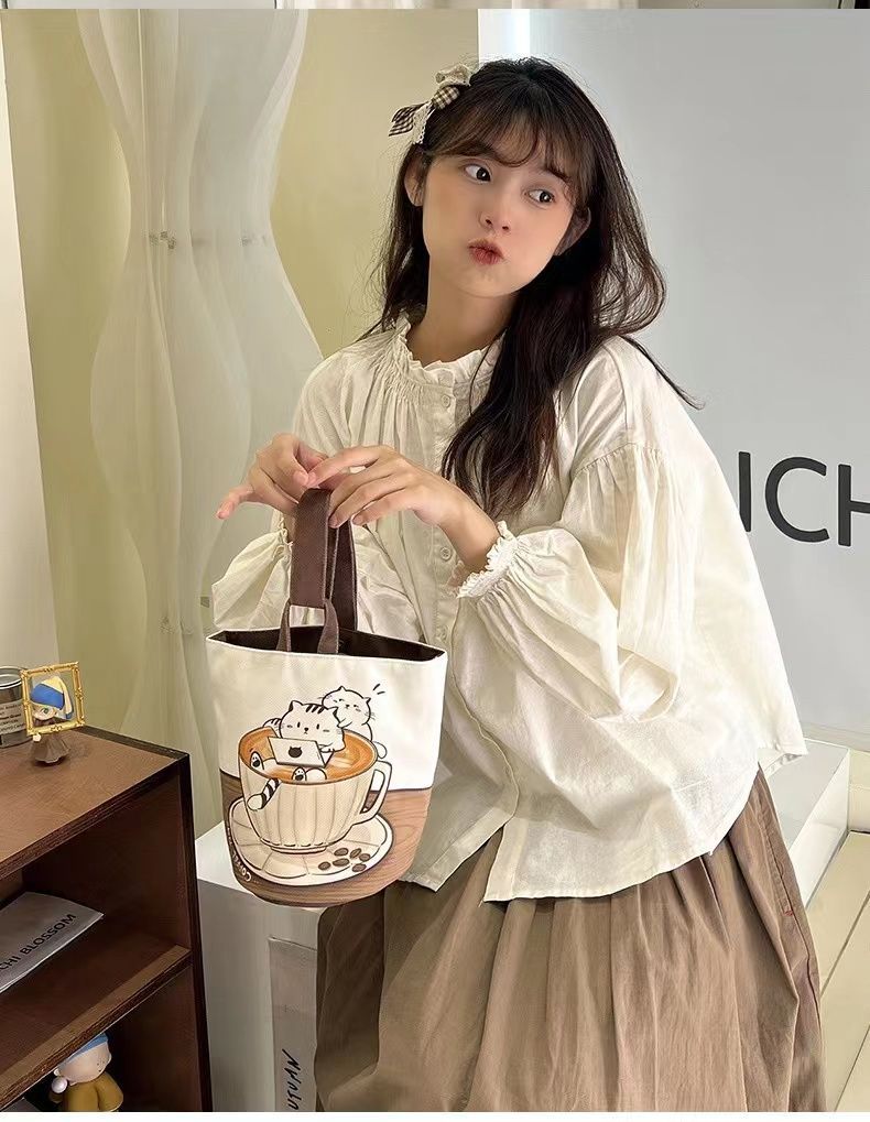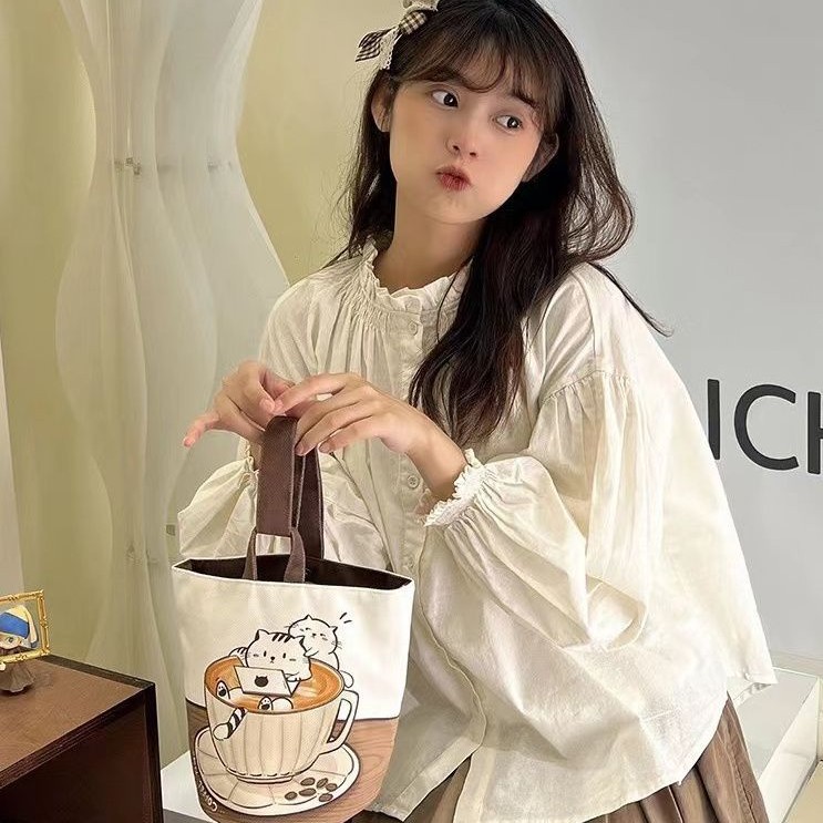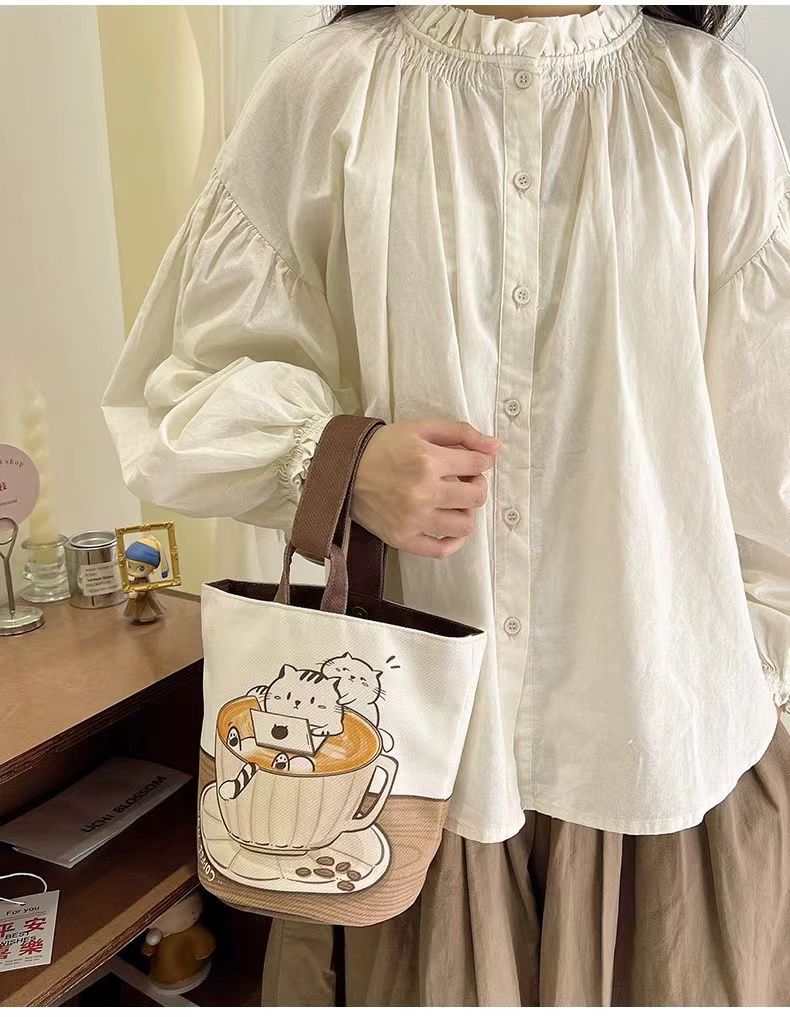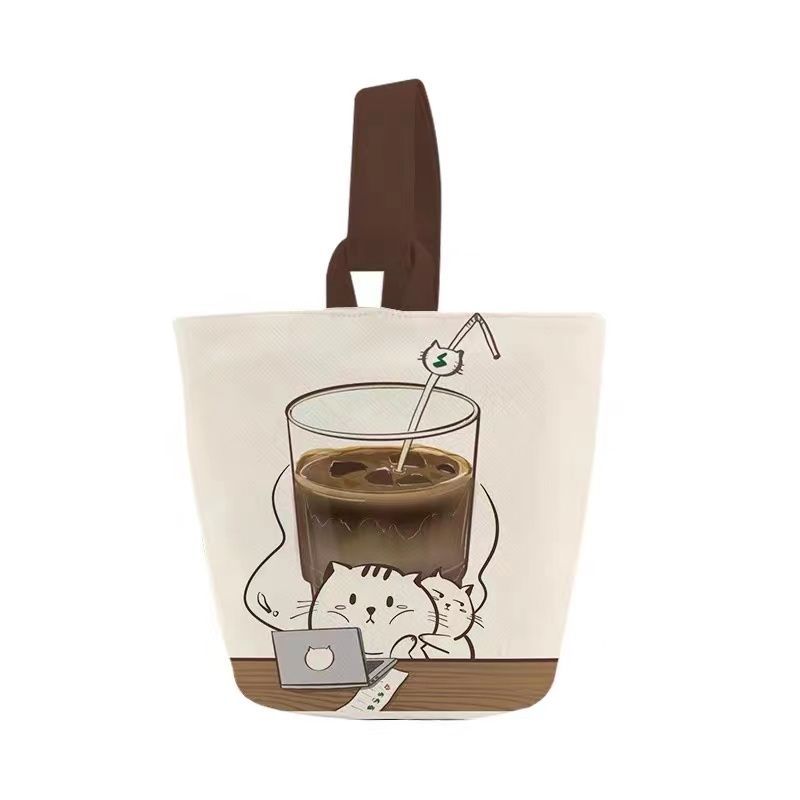 Cute Coffee Cat Portable Mummy Canvas Bag Shopping Student Cute Bucket Hand Lunch Box Handbag for Women