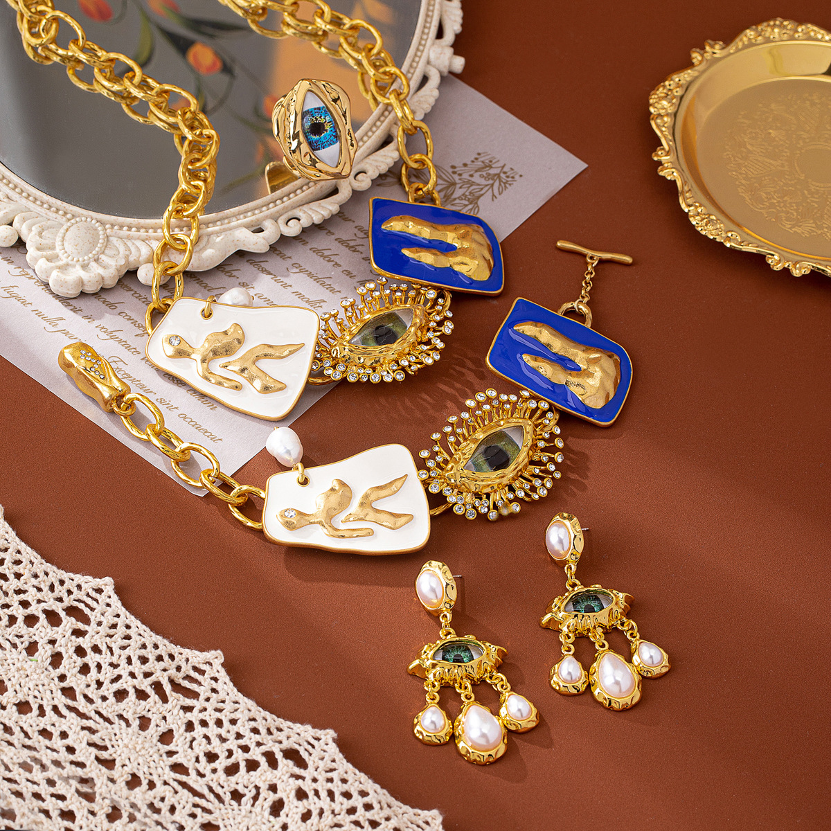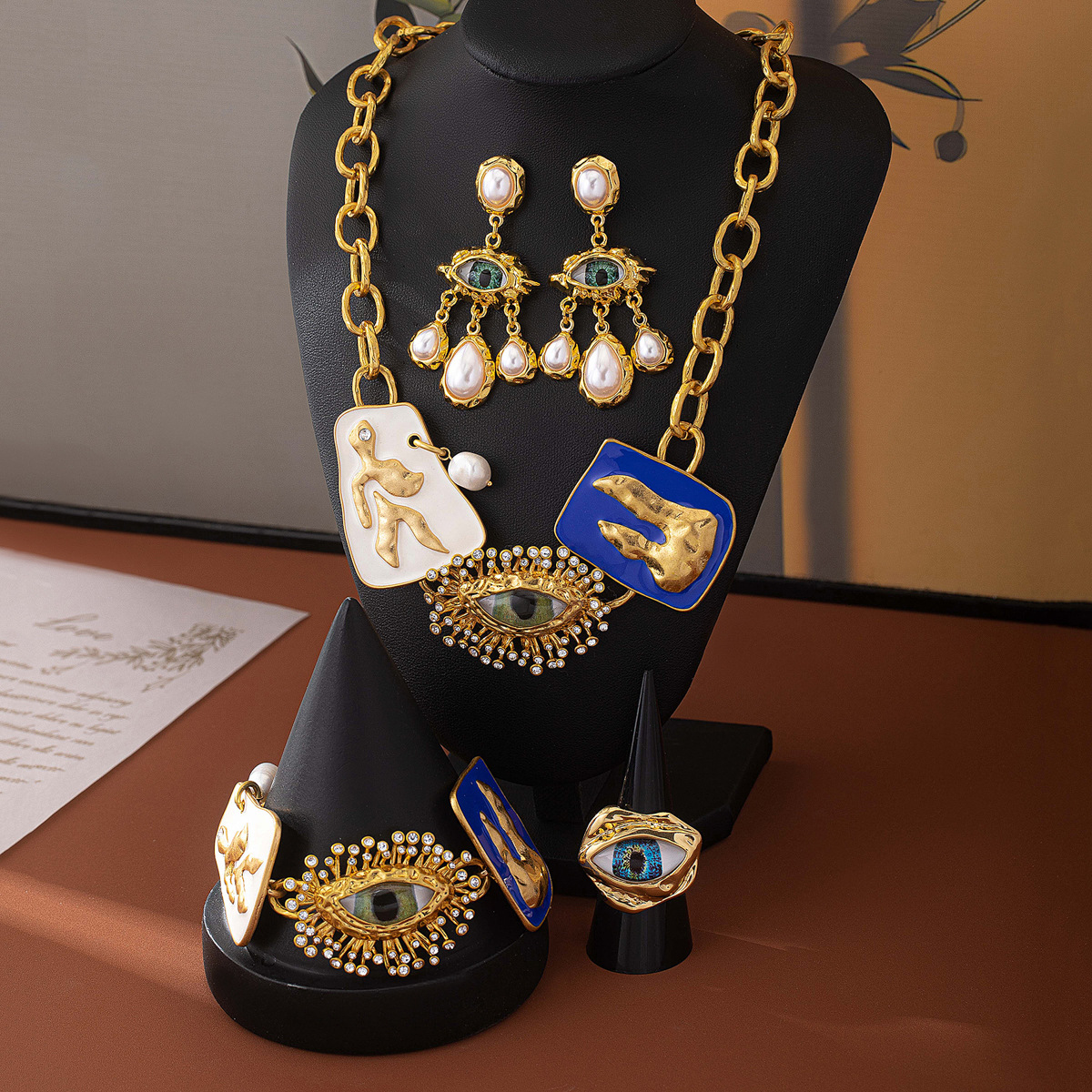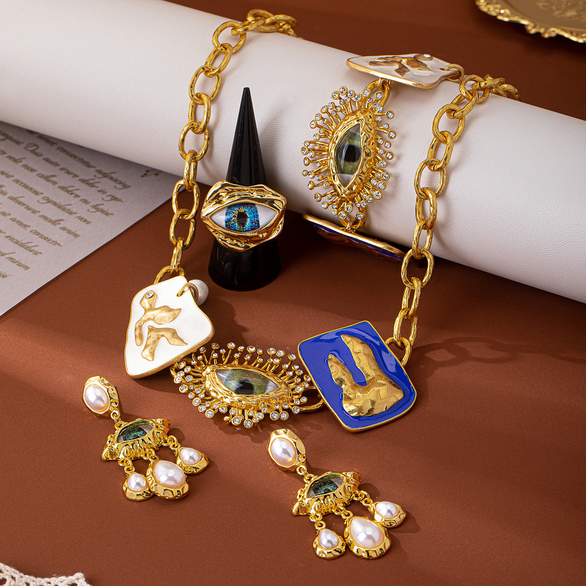 Vintage Gold Devil's Eye Copper Gold-Plated Enamel Necklace, Bracelet, Earring, and Ring Set