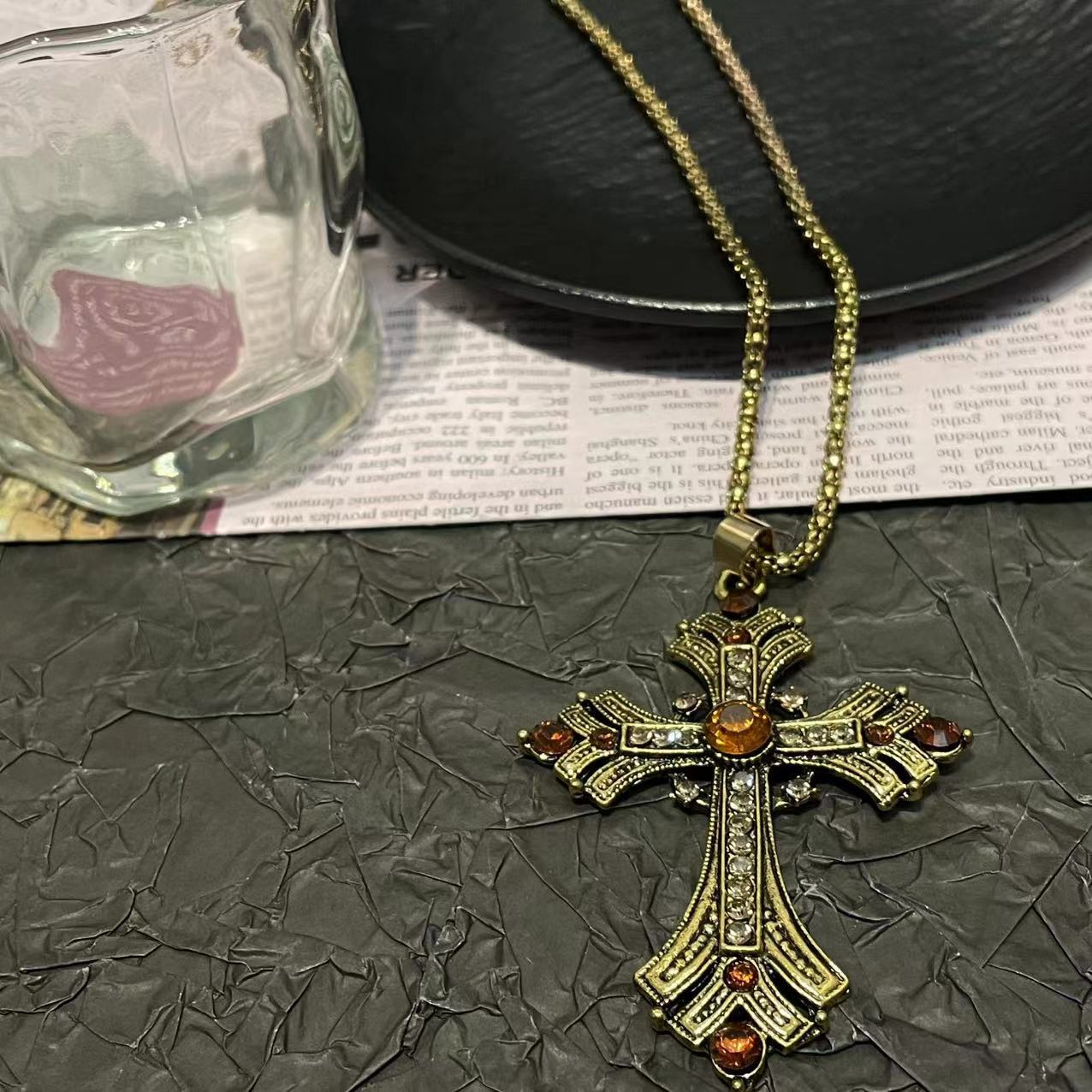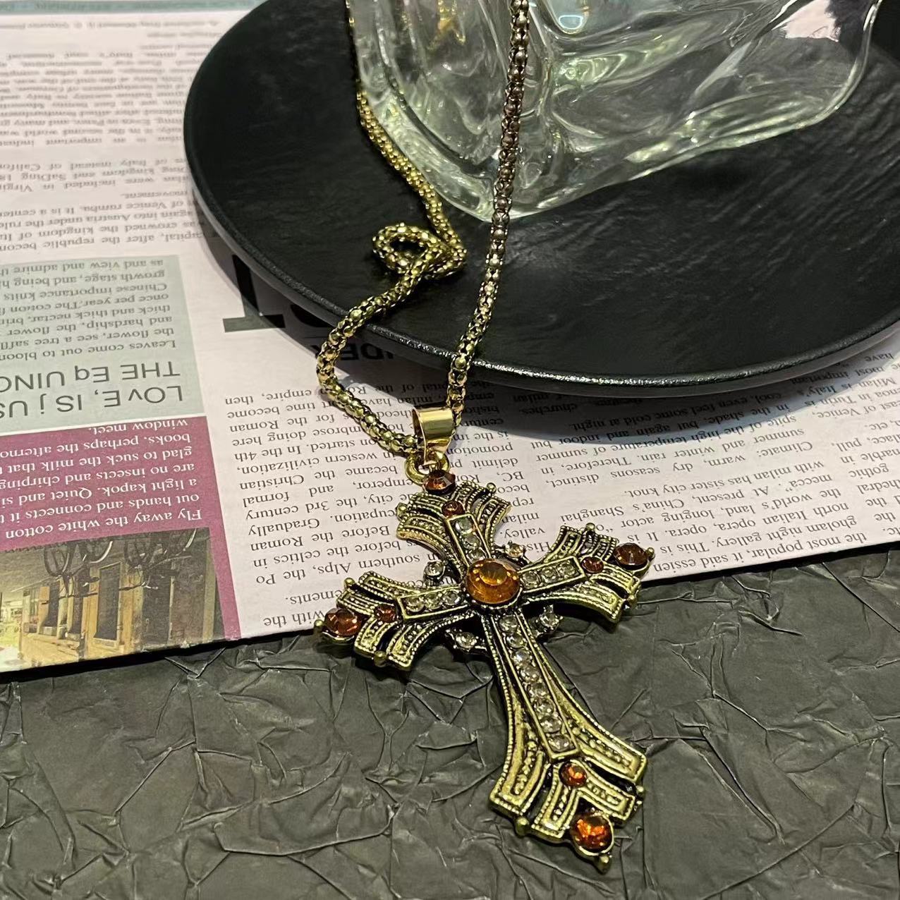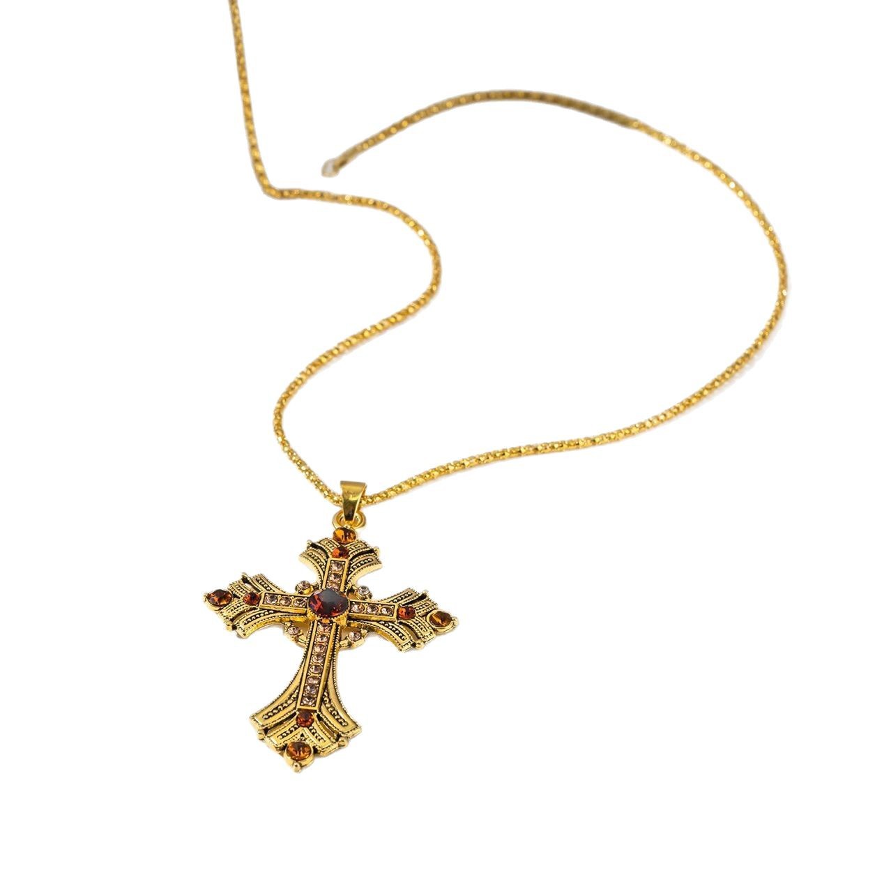 Golden Middle Ancient Asian Culture Cross Rhinestone Necklace Millennium Sweet Cool Style Long Collarbone Chain Spice Girl
