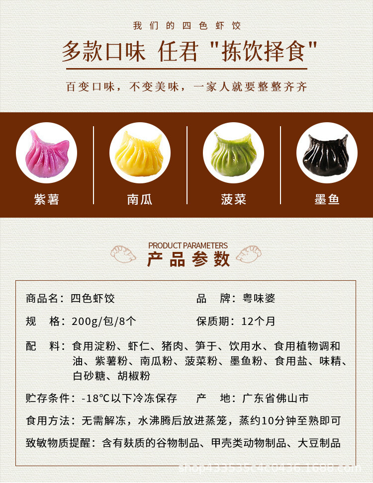 Packaging specifications: Four-color shrimp dumplings 200g/pack