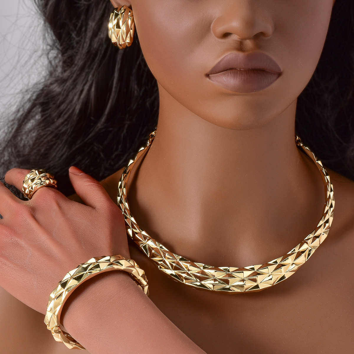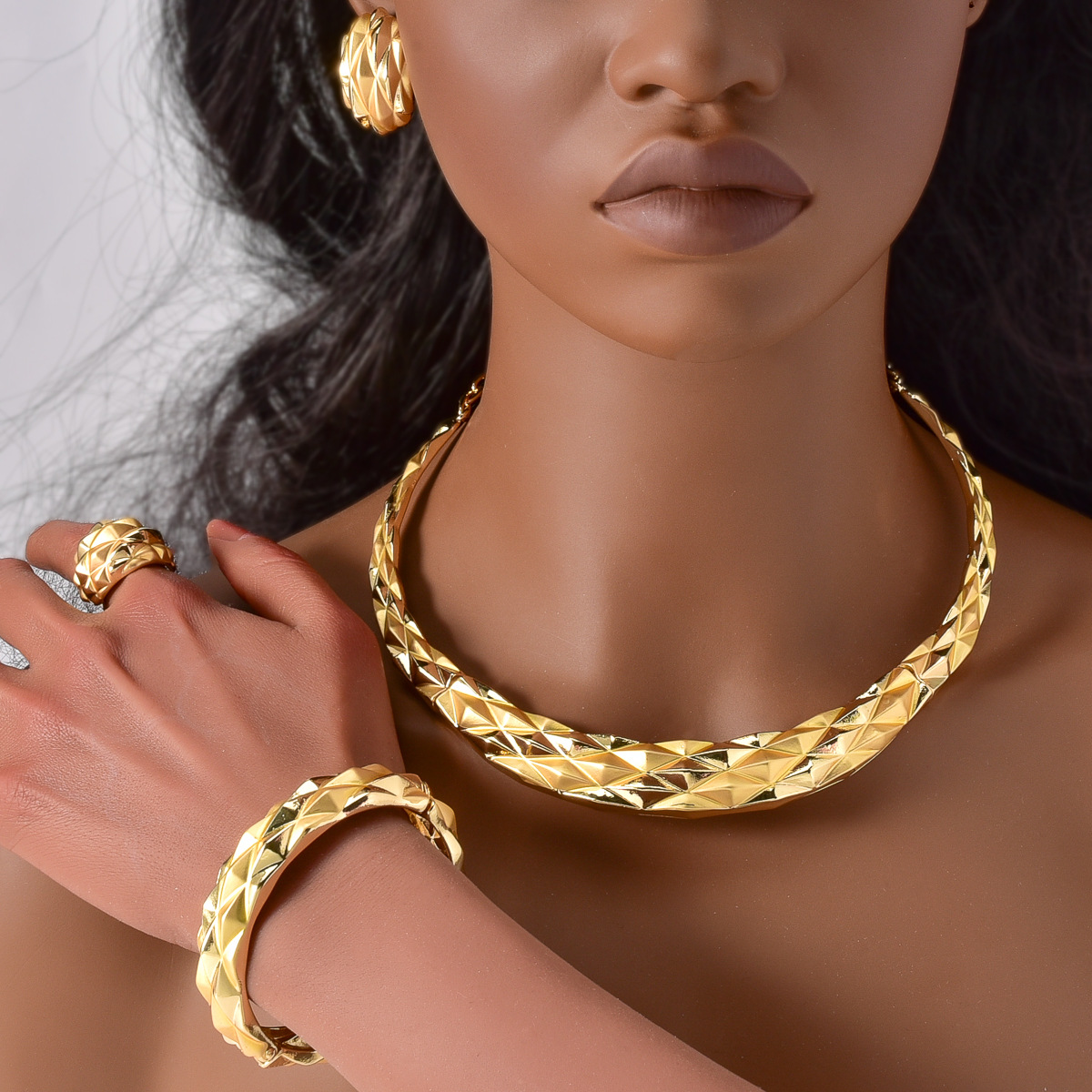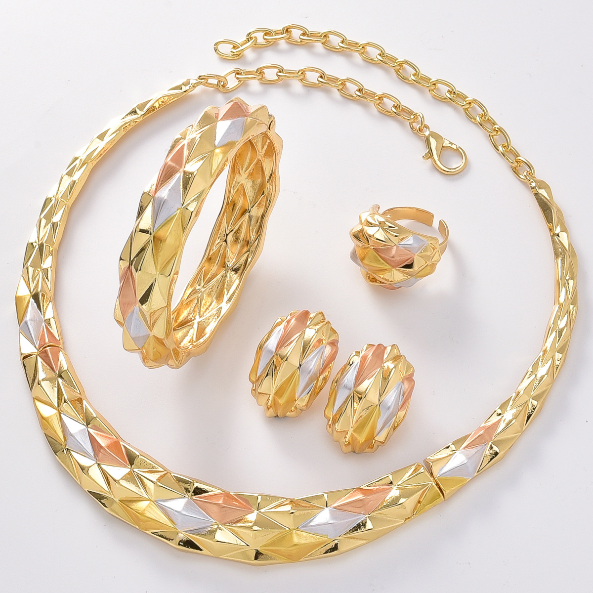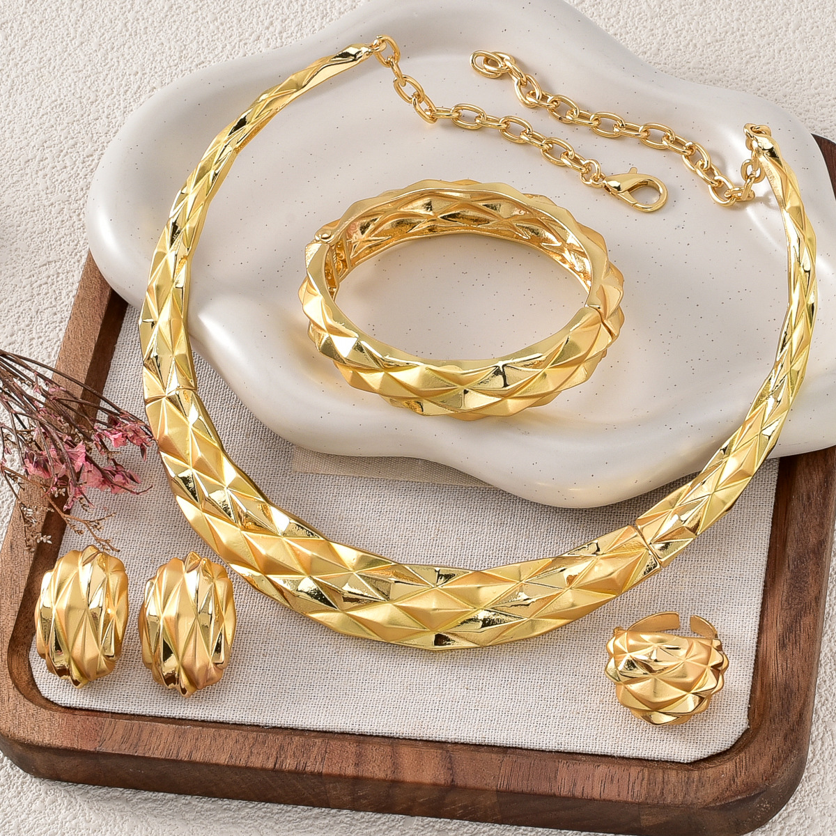 Hot Selling European and American Cross-border 18K Gold Cohesion Pique Ring Necklace Earrings Bracelet Indian Women's Banquet Jewelry Set