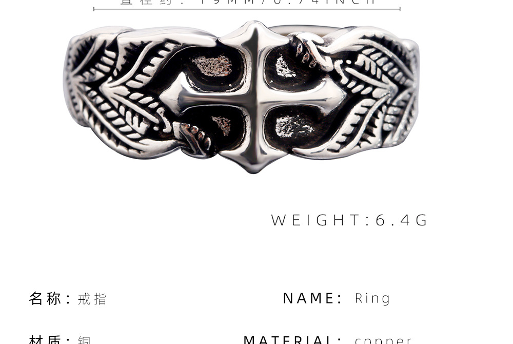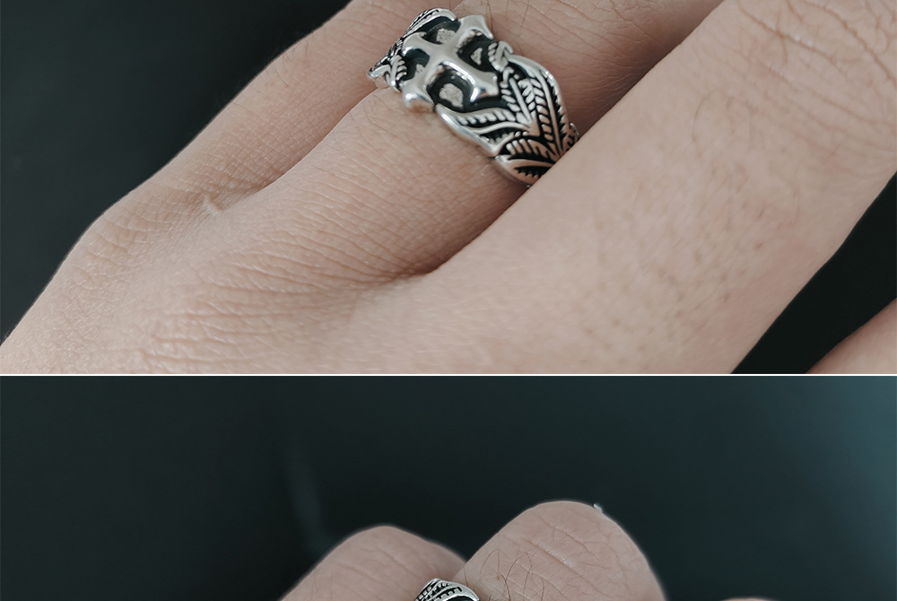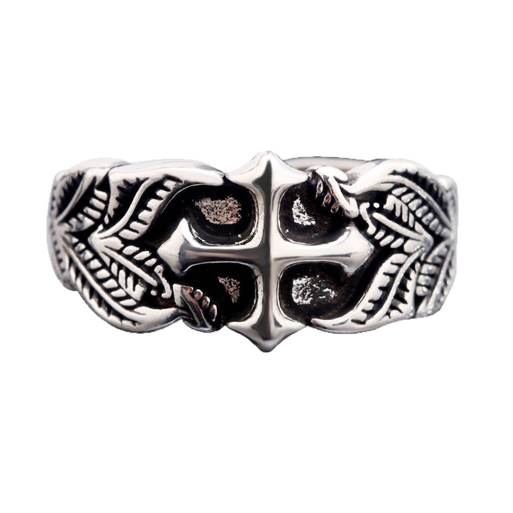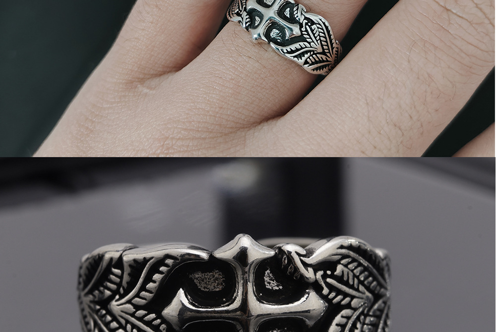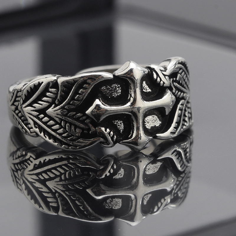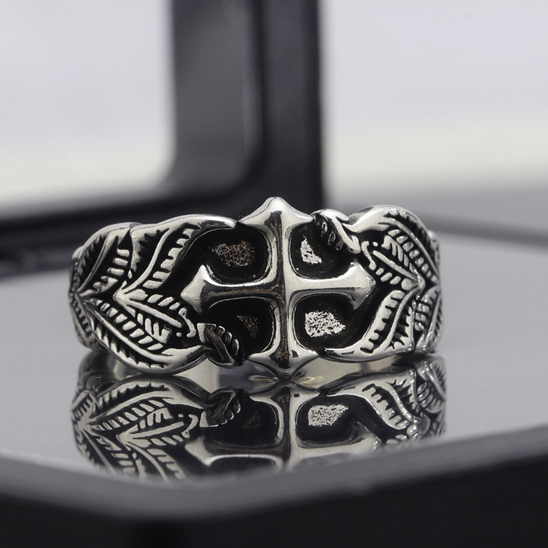 Vintage Cross Ring Men's Trendy Personalized Hip-Hop Style Leaf Texture Finger Ring Advanced Sense Imitation Thai Silver Open Ring