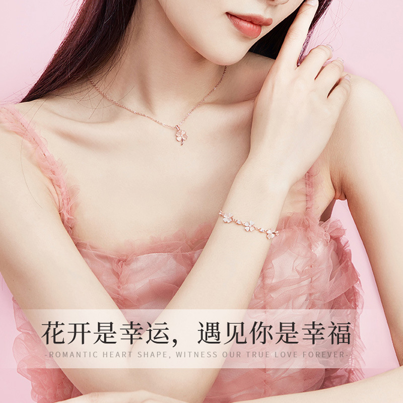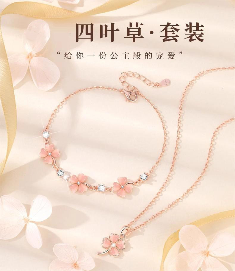 Cat's Eye Clover Necklace Women's Pink Diamond Flower Bracelet Pendant Fashion Girly Heart Jewelry Pink Peach Blossom Set