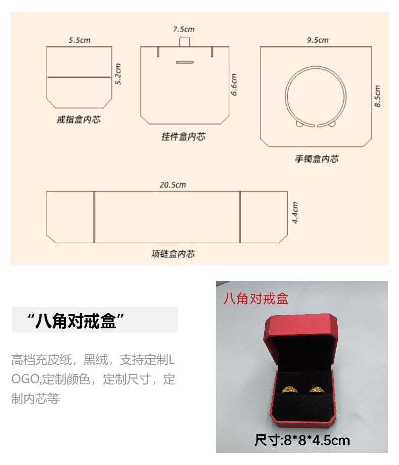 戒指盒、吊坠盒、手镯盒、长项链盒默认内芯为常规做法,做法如下图: