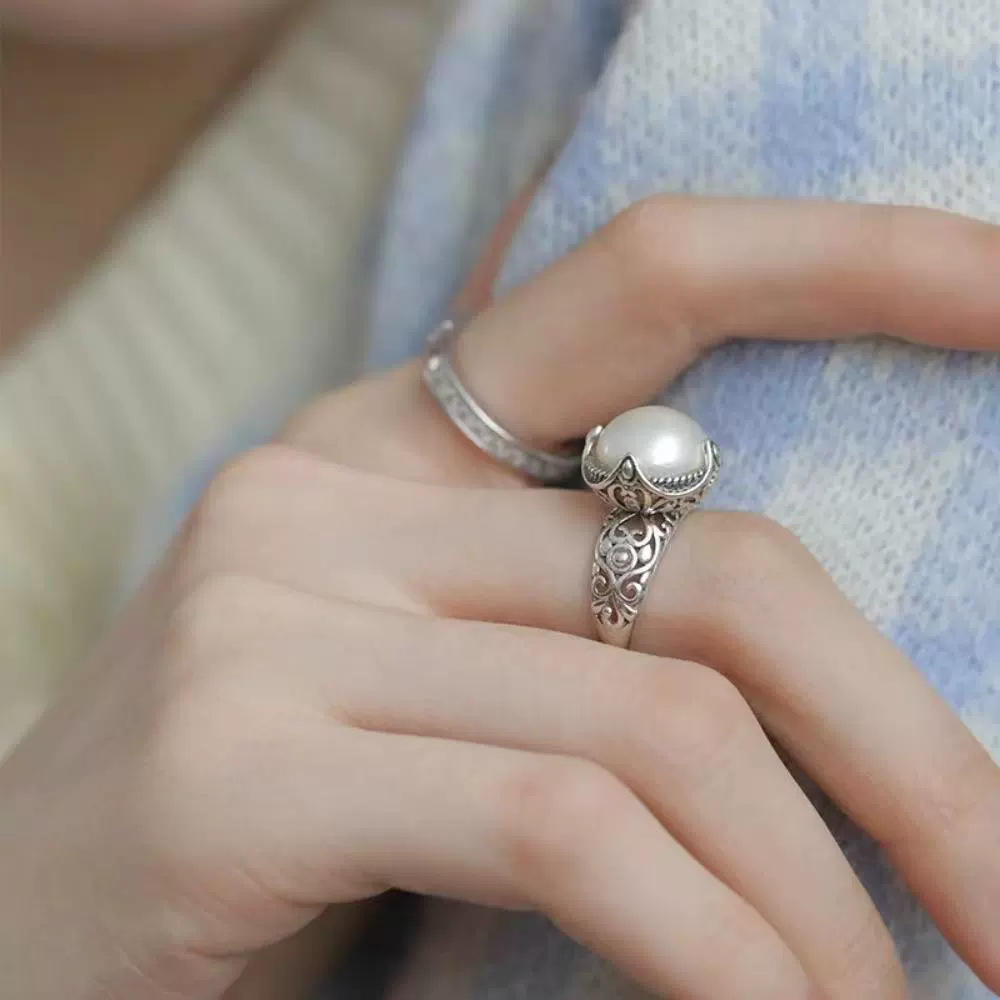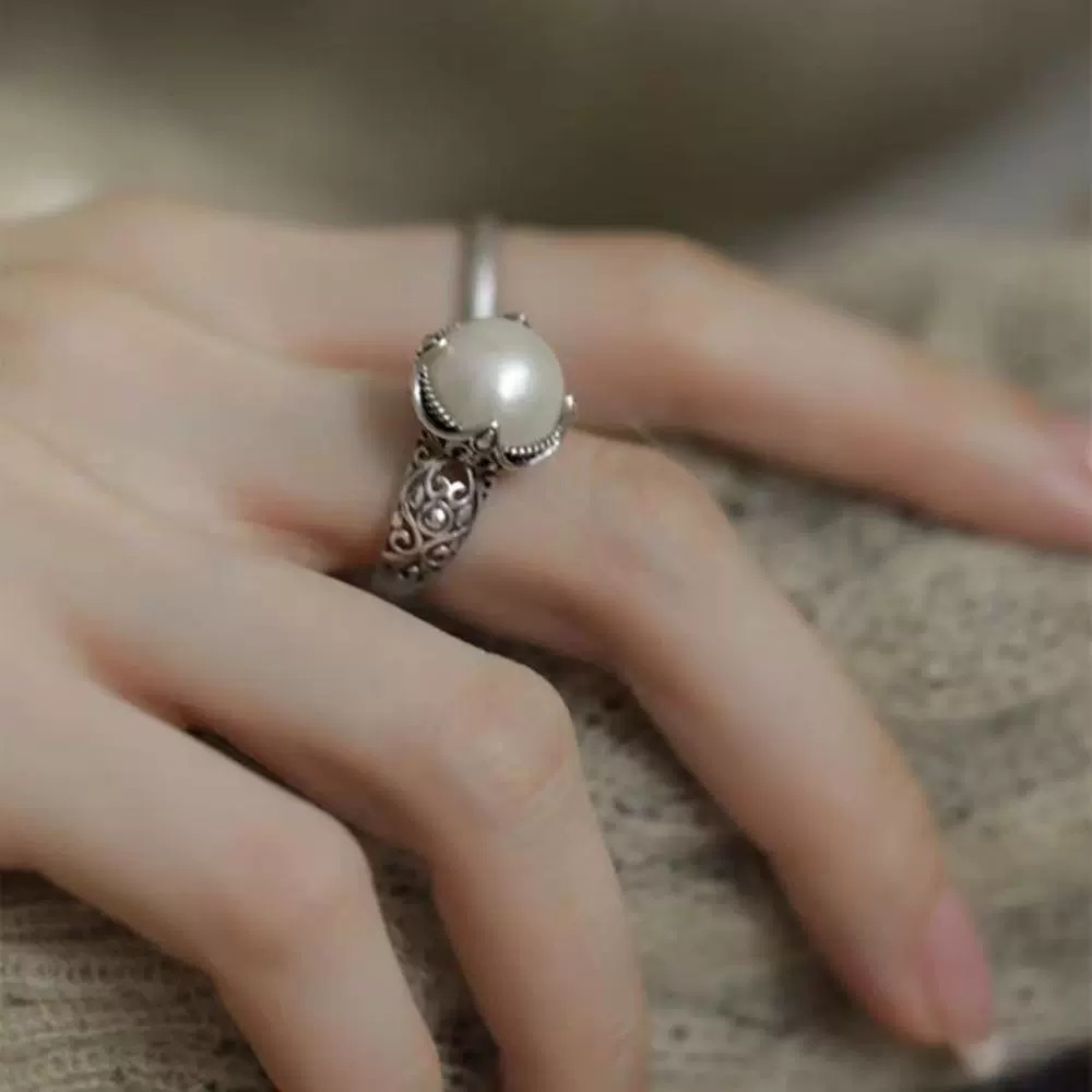 Vintage Distressed Pearl Ring Women's Fashion Personality Temperament Chinese Style Hollow Flower Opening Finger Ring All-match Finger