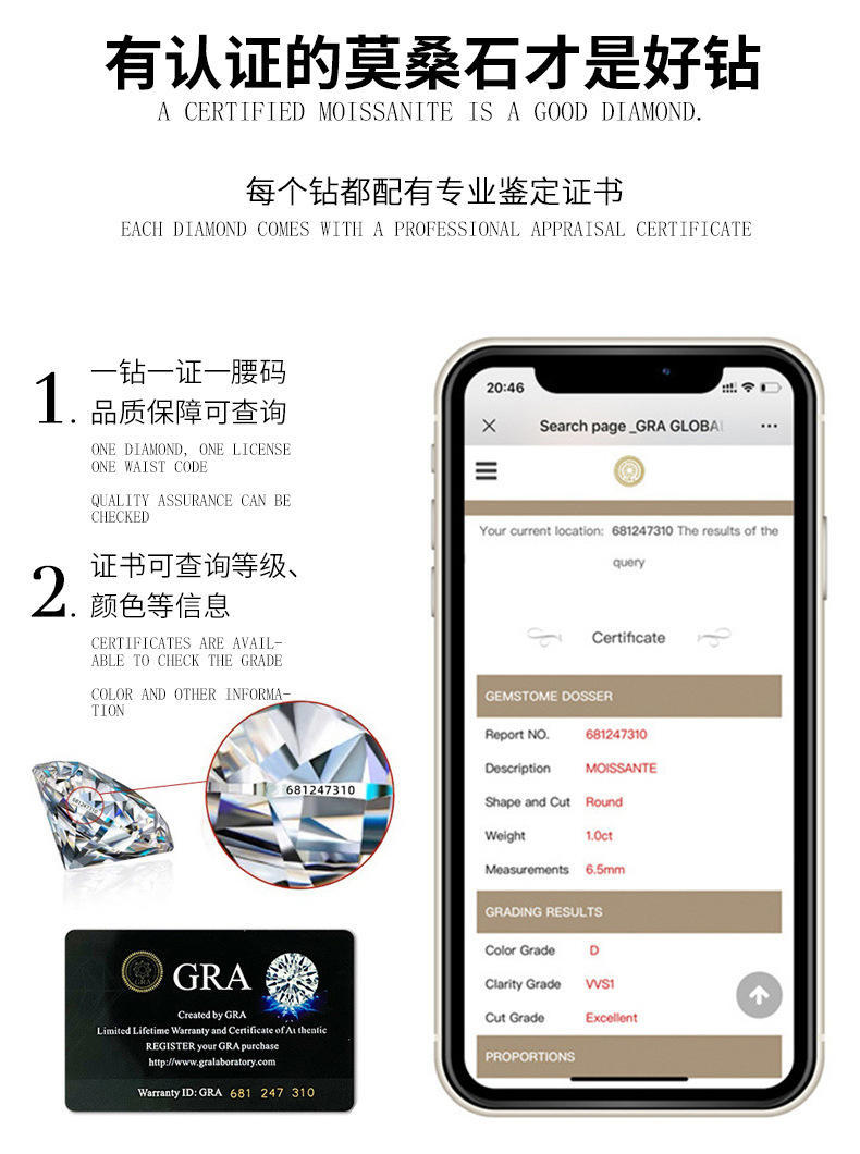 Color: S925 sterling silver (full moissanite) ring + gra certificate/black card