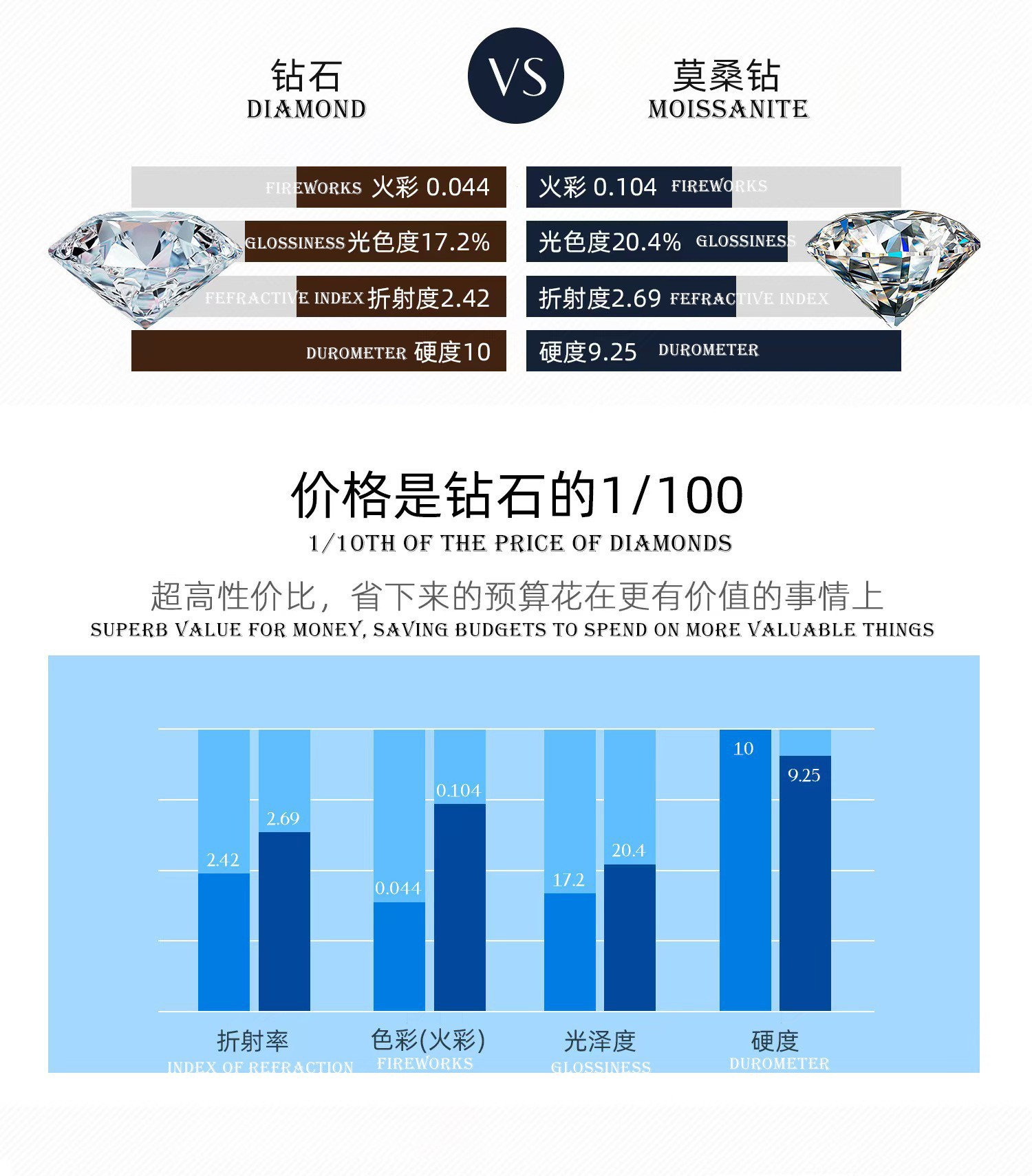 Moissanite specifications: 1.0 mm*100pcs/1.2 *14/2.0 *16/1.5 *104/1.7 *62/