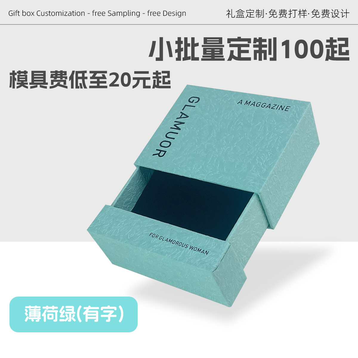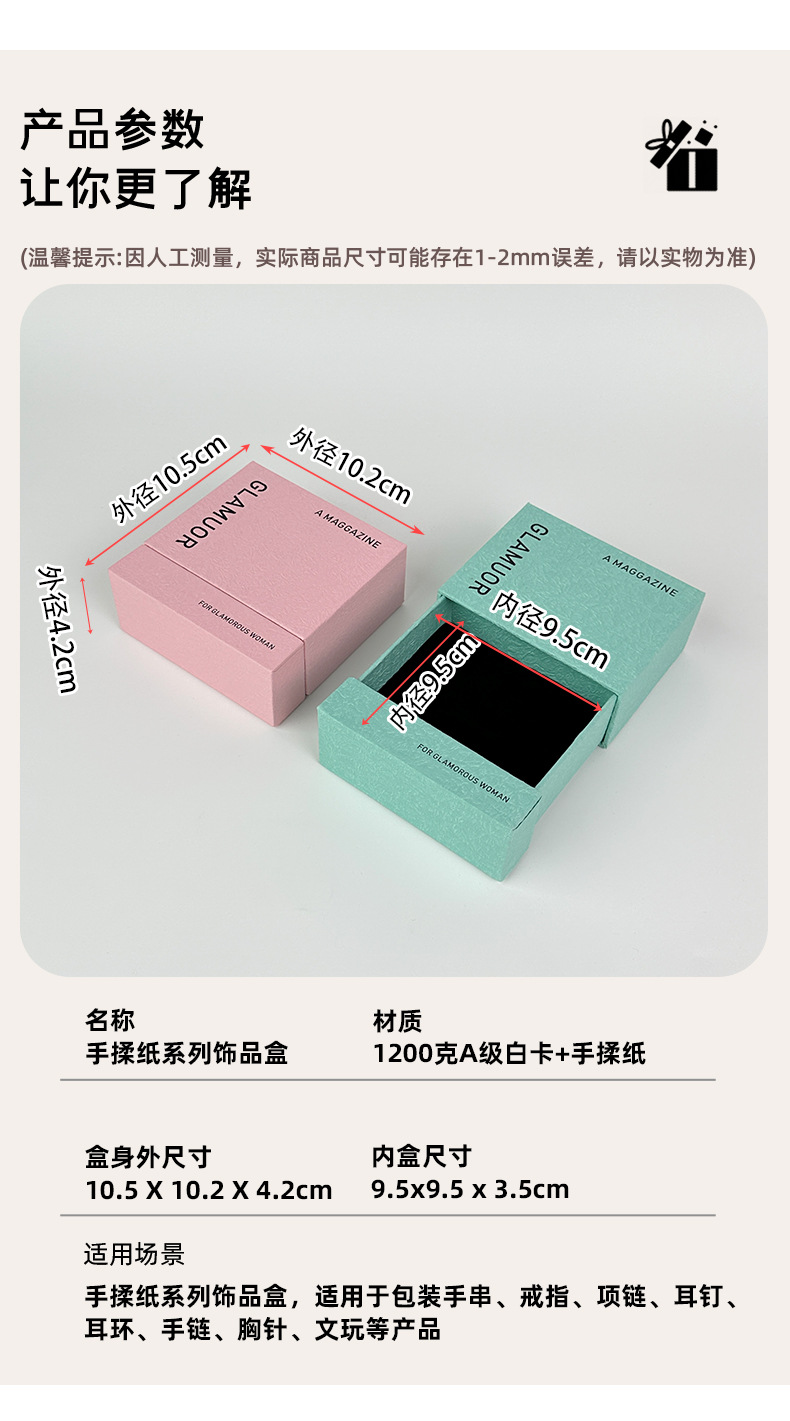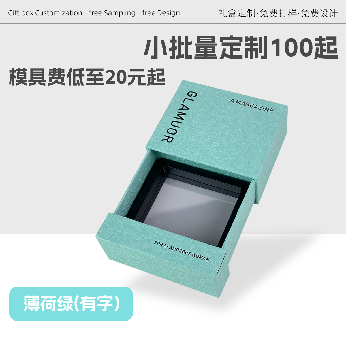 Specifications and models: Mint green hand-kneaded paper (with black hot stamping pattern)/lined with velvet sponge; 10.5*10.2*4.2cm (outer size)