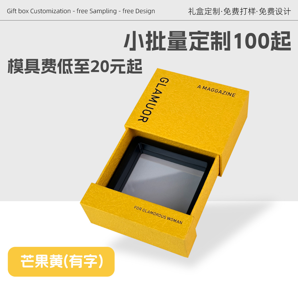 Specifications and models: Mango yellow hand-kneaded paper (with black hot stamping pattern)/lined with black suspension box; 10.5*10.2*4.2cm (outer size)