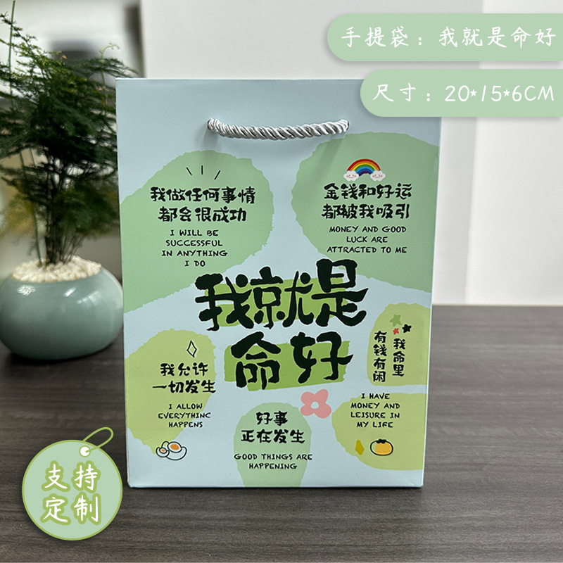 Specifications and models: I'm just lucky/handbag/double copper paper/4-color printing; 20*15*6cm