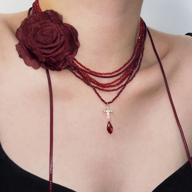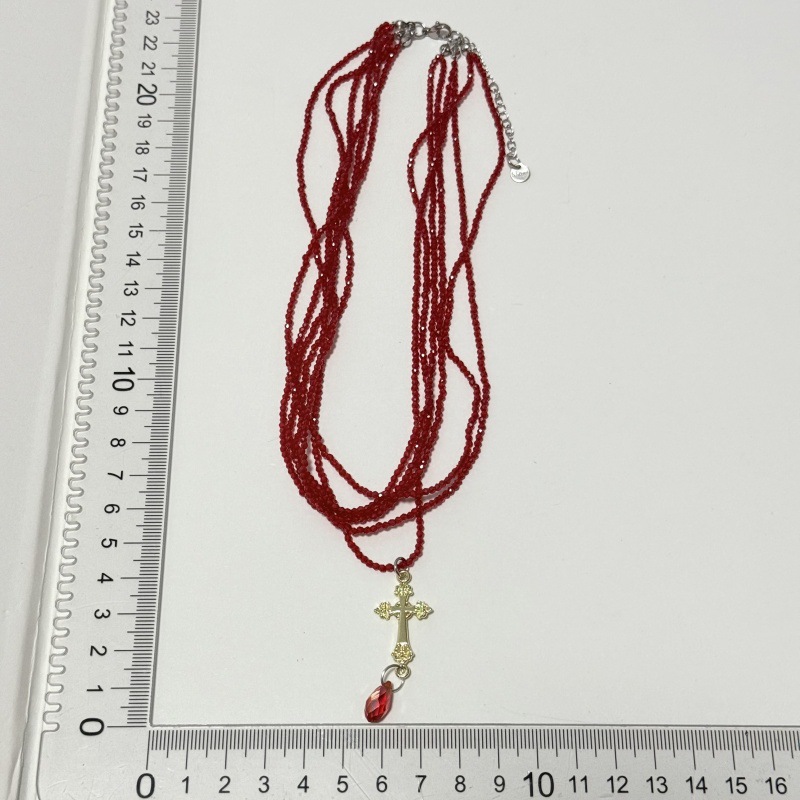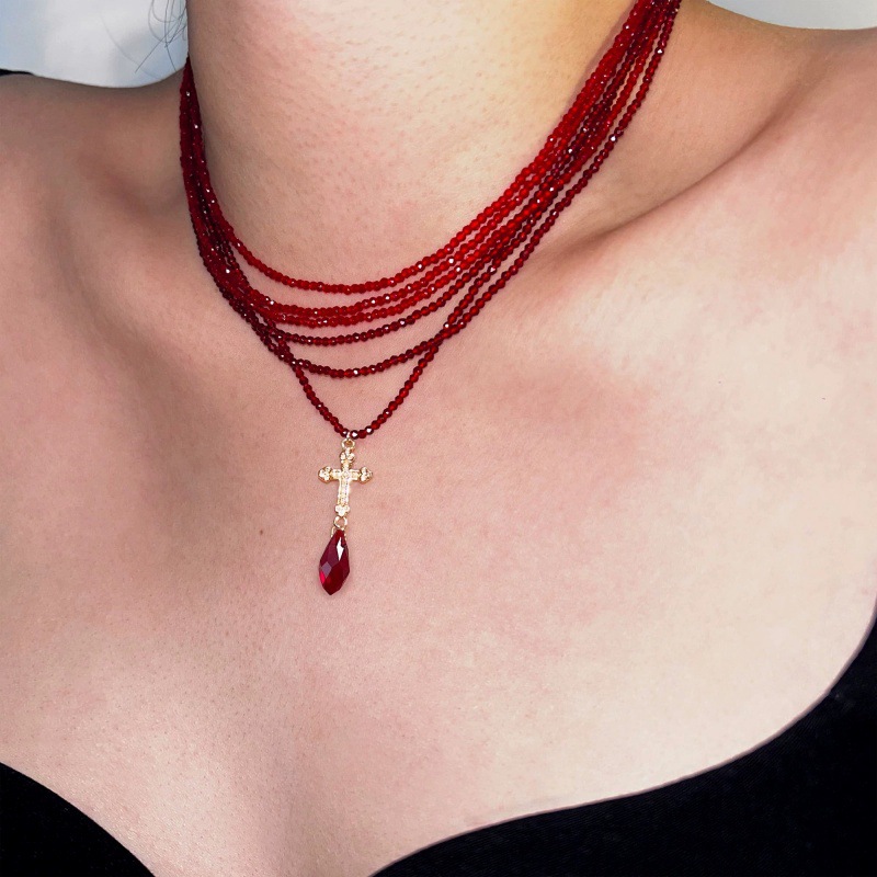 Fashion Sweet Cool Multi-layer Red Crystal Stacked Cross Pendant Necklace Niche Elegant Stacked Necklace Clavicle Chain