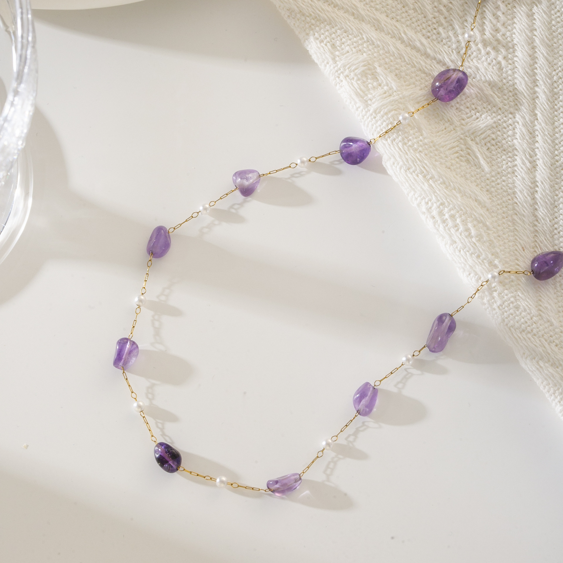 New Necklace for Women, Simple Purple Natural Stone Clavicle Necklace, Light Luxury Niche Bracelet, Stainless Steel Jewelry Set