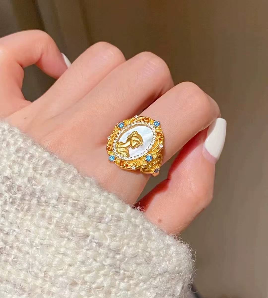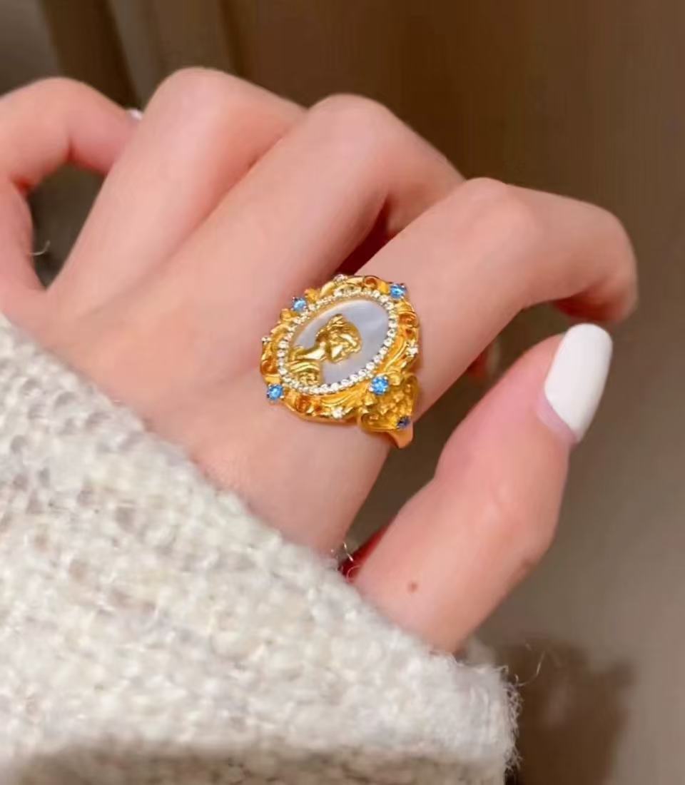 Palace Retro French Handmade Light Luxury Jewelry Queen of Fritillaria Embossed Pearl Double Layer Pendant Ring Banquet Accessories