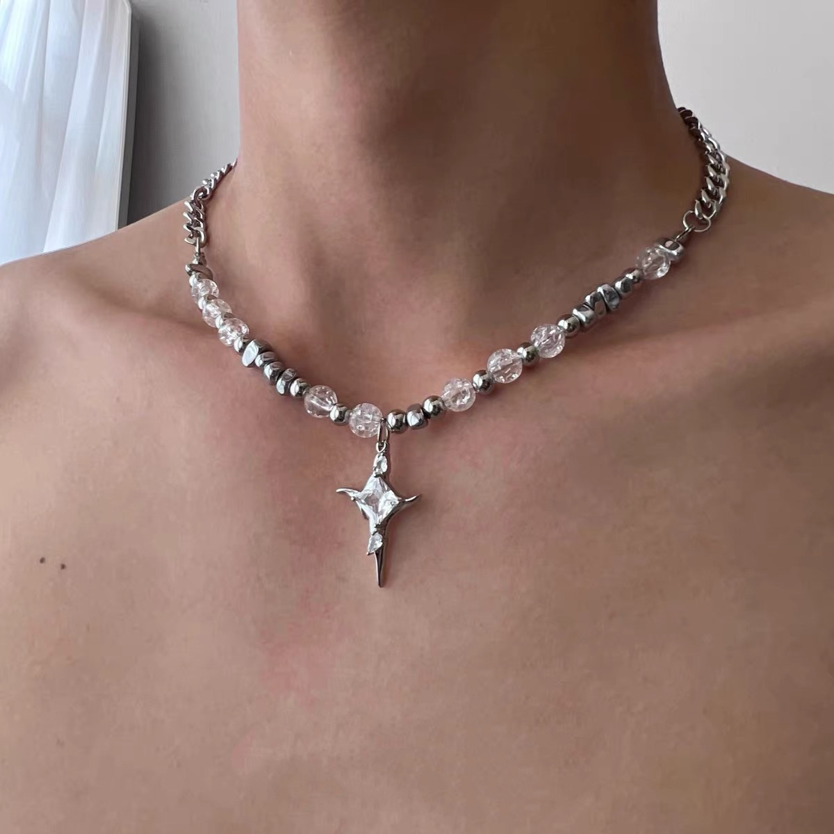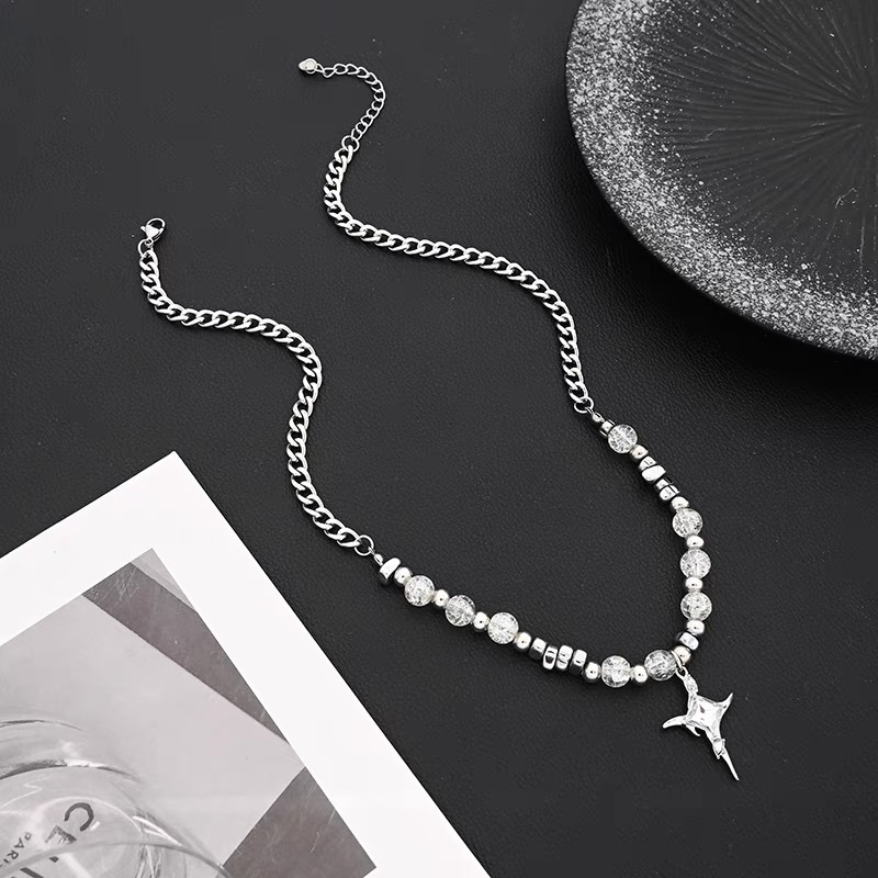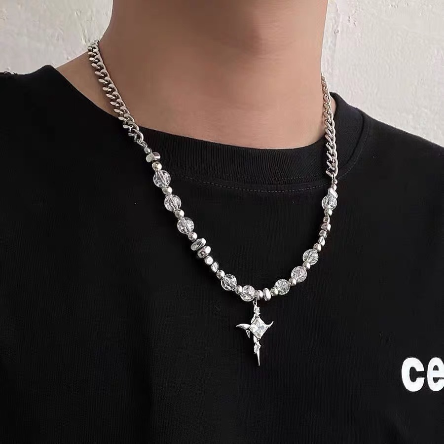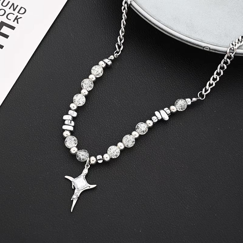 Ice Crack Bead Cross Star Necklace Men's Niche High-end Stitching Pendant Sweat Chain Distinctive Collarbone Chain Accessories Women