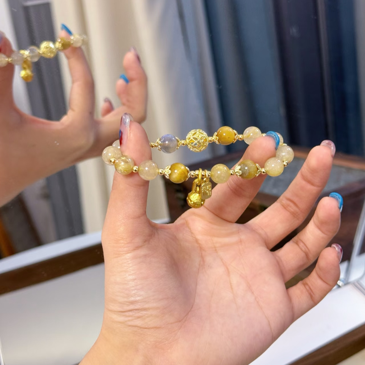 Natural Blonde Crystal Gold Tiger Eye Bracelet, Gold-Eating Beast, Rich Citrine Moonstone Mixed with Titanium Crystal Bracelet Career