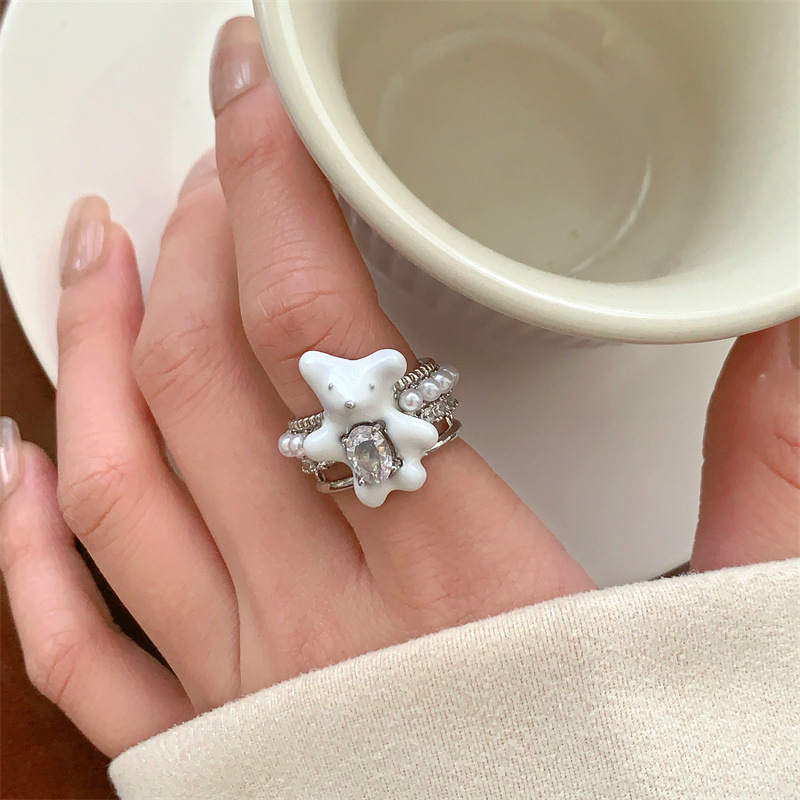 Niche Diamond-encrusted Pearl Brightening Mini Bear Ring Women's Gift Opening Ring High-grade Sense Personality Design Ring