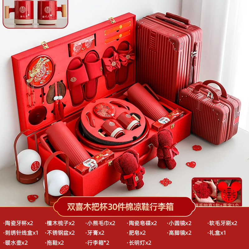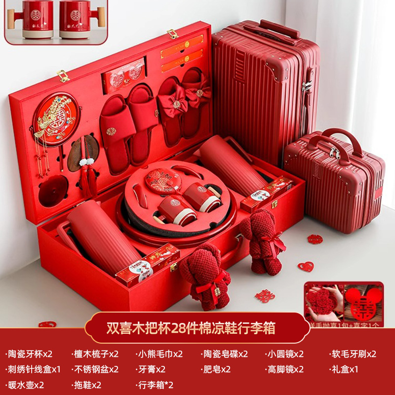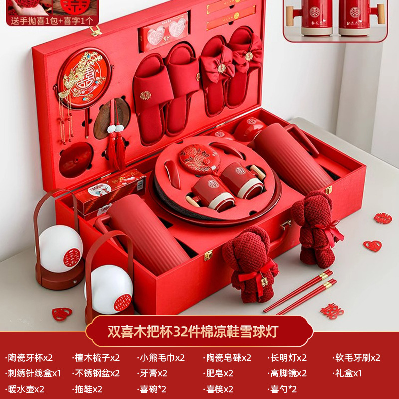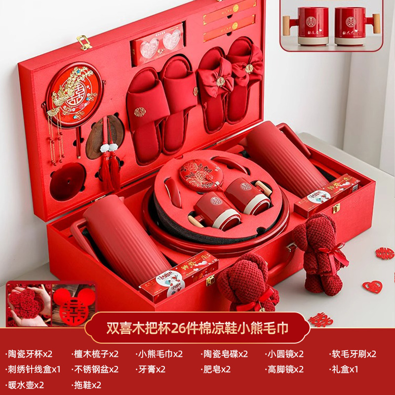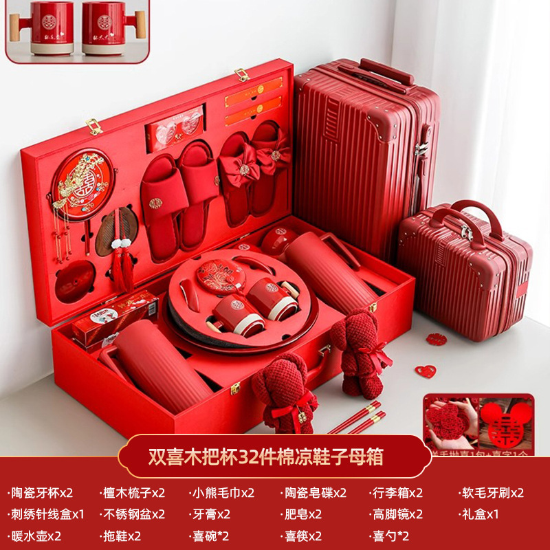 Color: [big gift box set of 32 pieces] double happiness wooden handle cup, bear towel, red happiness pot, happiness bowl, 20inch mother-child box, half pack of cotton sandals
