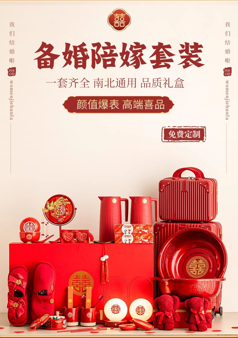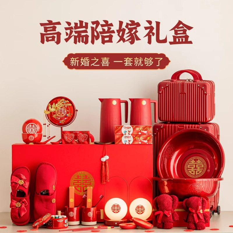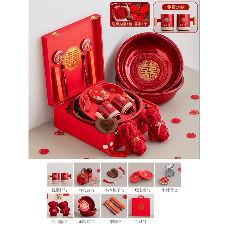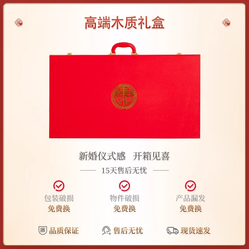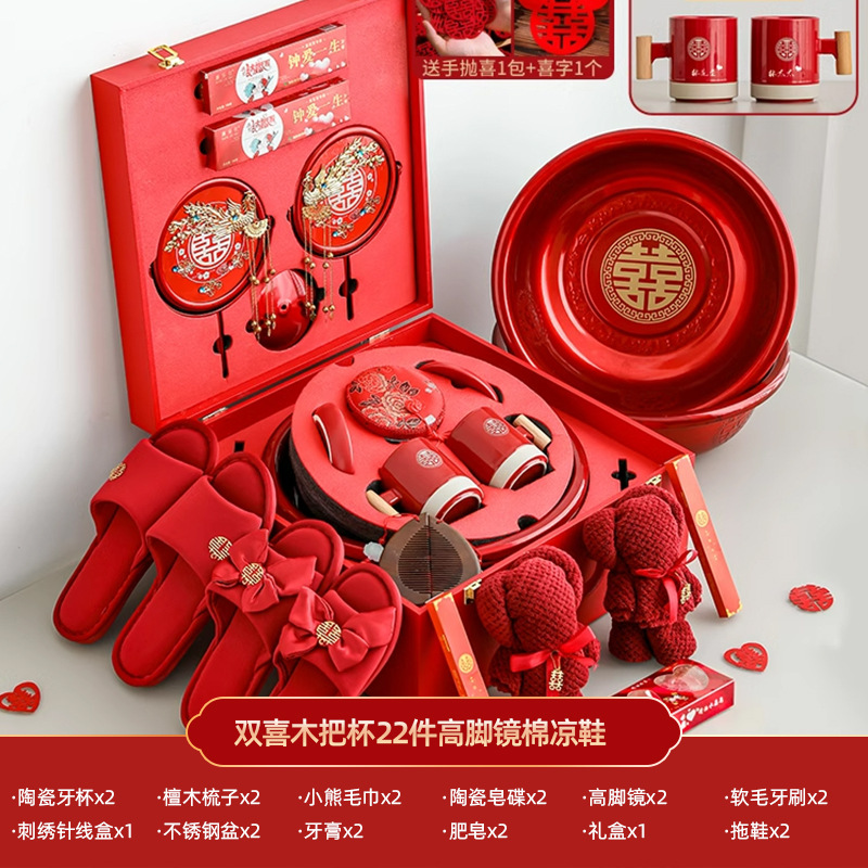Color: [big gift box set of 32 pieces] double happiness wooden handle cup, bear towel, red happiness pot, happiness bowl, 20inch mother-child box, half pack of cotton sandals