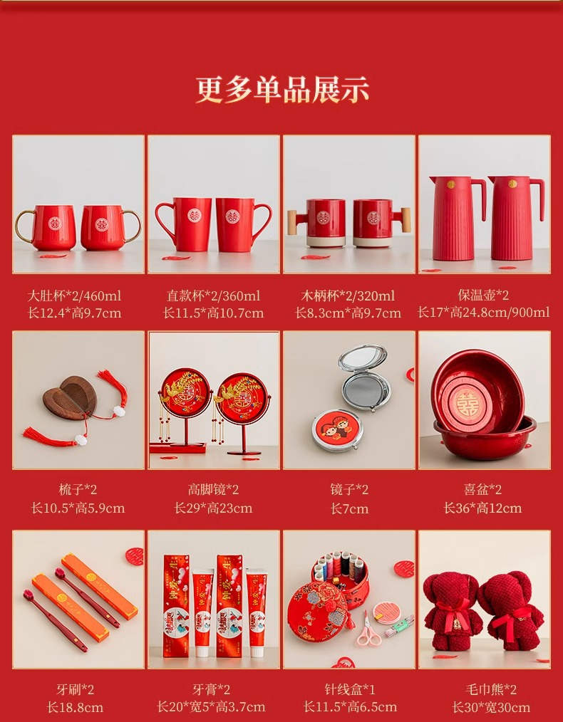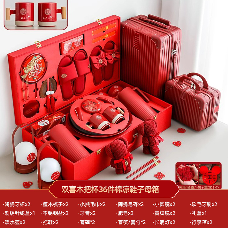 Color: [big gift box set of 36 pieces] double happiness wooden handle cup, bear towel, red happiness pot, happiness bowl, long lantern, 20inch mother-child box, half pack of cotton sandals
