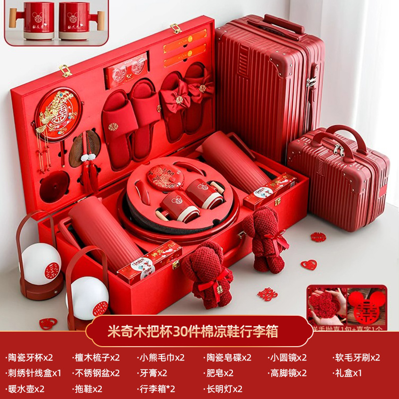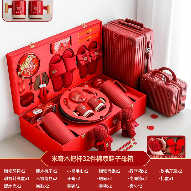 Color: [big gift box set of 32 pieces] mickey wooden handle cup, bear towel, red wedding pot, wedding bowl, 24inch mother-child box, half pack of cotton sandals