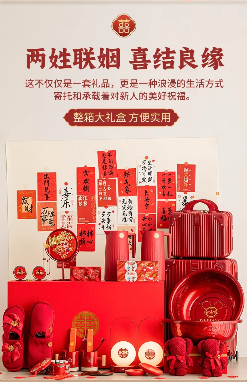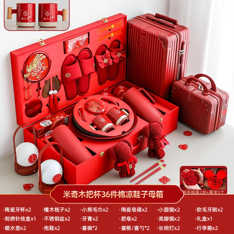 Color: [big gift box set of 36 pieces] mickey wooden handle cup, bear towel, red wedding pot, wedding bowl, long lantern, 24inch mother-child box, half pack of cotton sandals