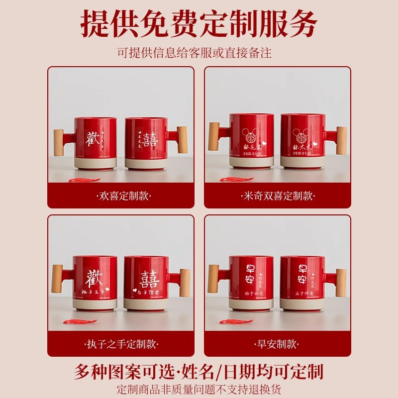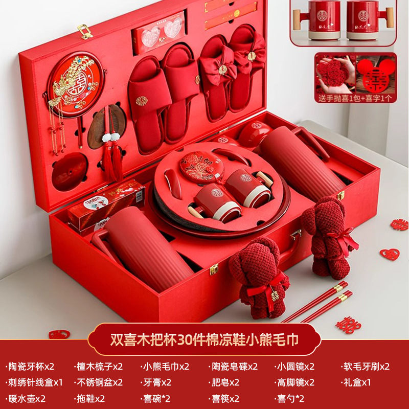Color: [big gift box set of 30 pieces] double happiness wooden handle cup, bear towel, red happiness pot, happiness bowl, half pack of cotton sandals
