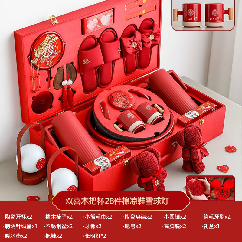 Color: [big gift box set of 28 pieces] double happiness wooden handle cup, bear towel, red happiness pot, eternal light, half pack of cotton sandals