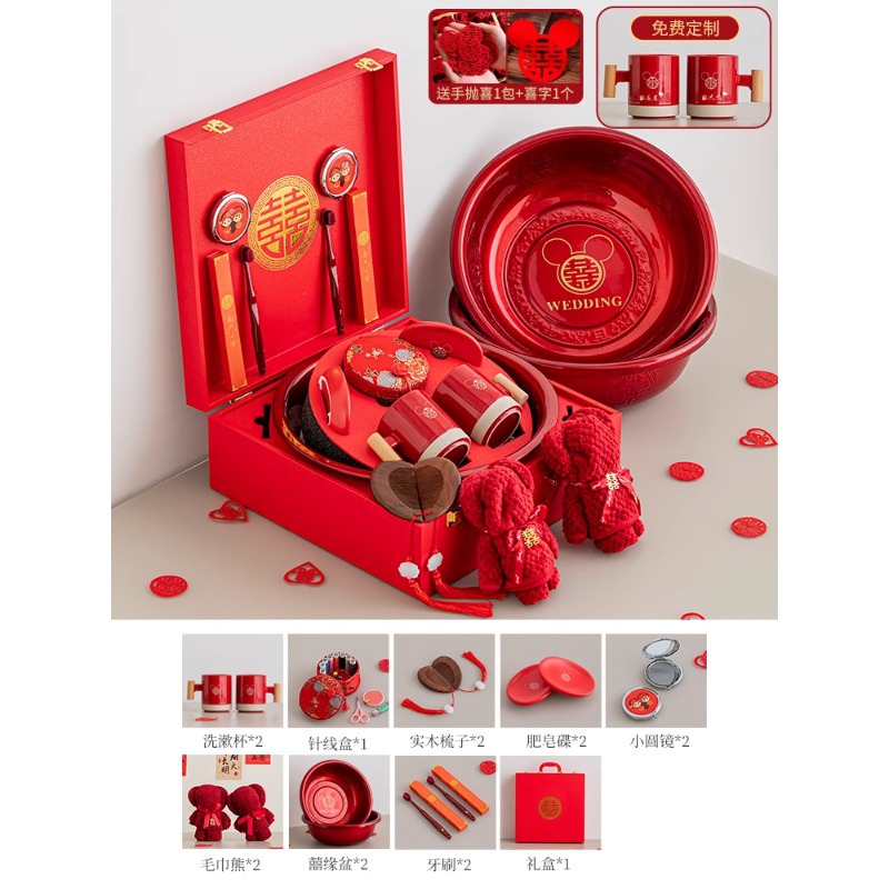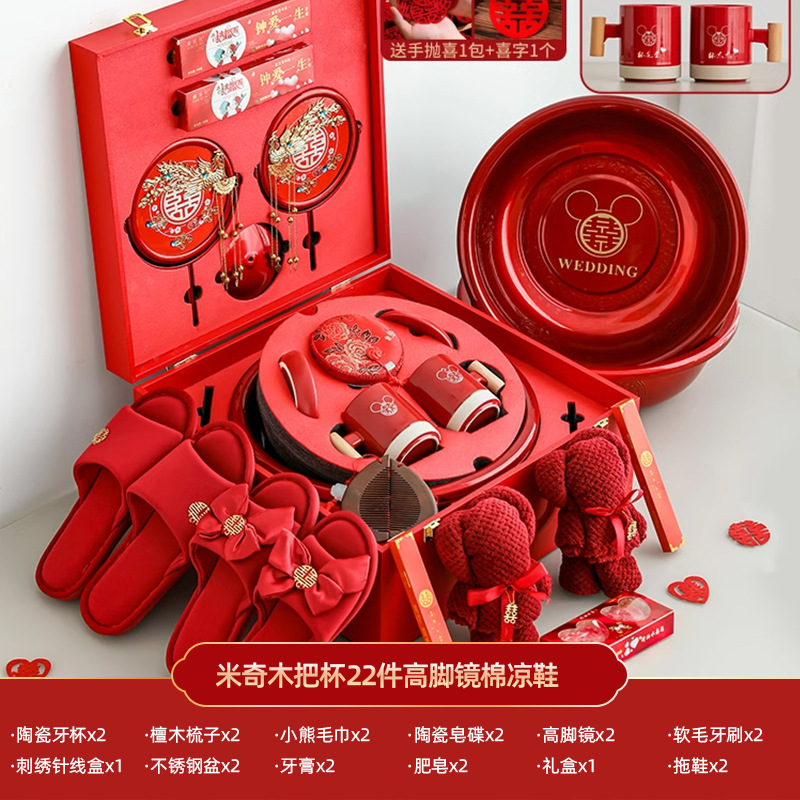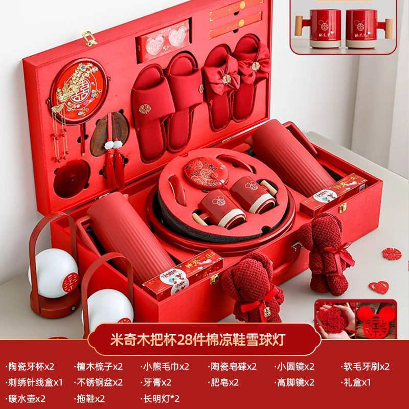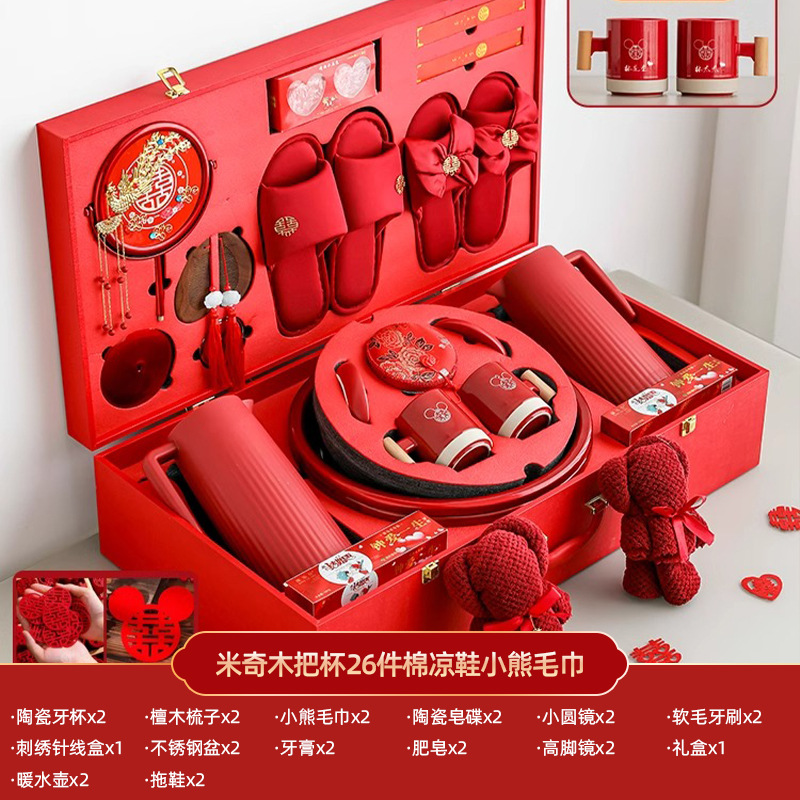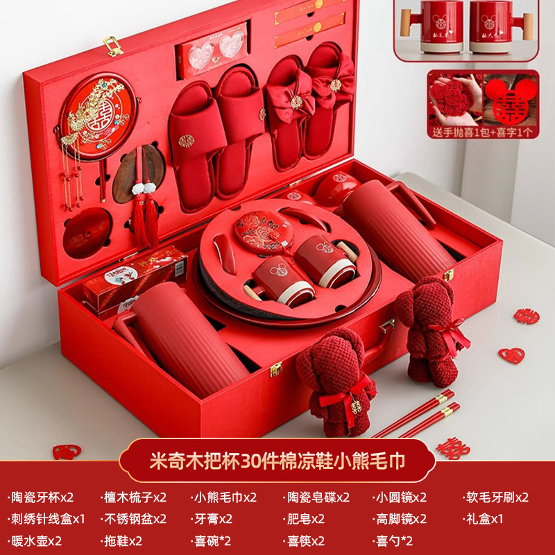 Color: [big gift box set of 32 pieces] mickey wooden handle cup, bear towel, red wedding pot, wedding bowl and eternal light, half pack of cotton sandals