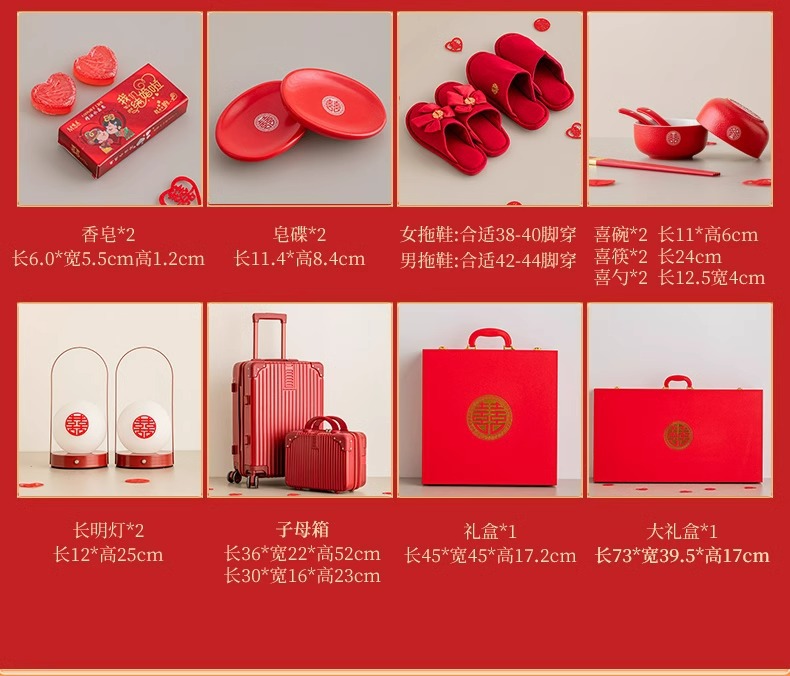 Color: [big gift box set of 36 pieces] double happiness wooden handle cup, bear towel, red happiness pot, happiness bowl, long lantern, 24inch mother-child box, half pack of cotton sandals