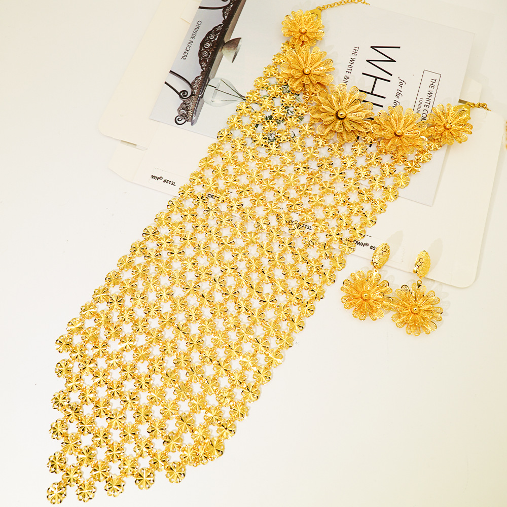 Cross Border 24K Gold Plated Dubai Luxury Shiny Big Flower Ladies Banquet Long Necklace Bracelet Earrings suit