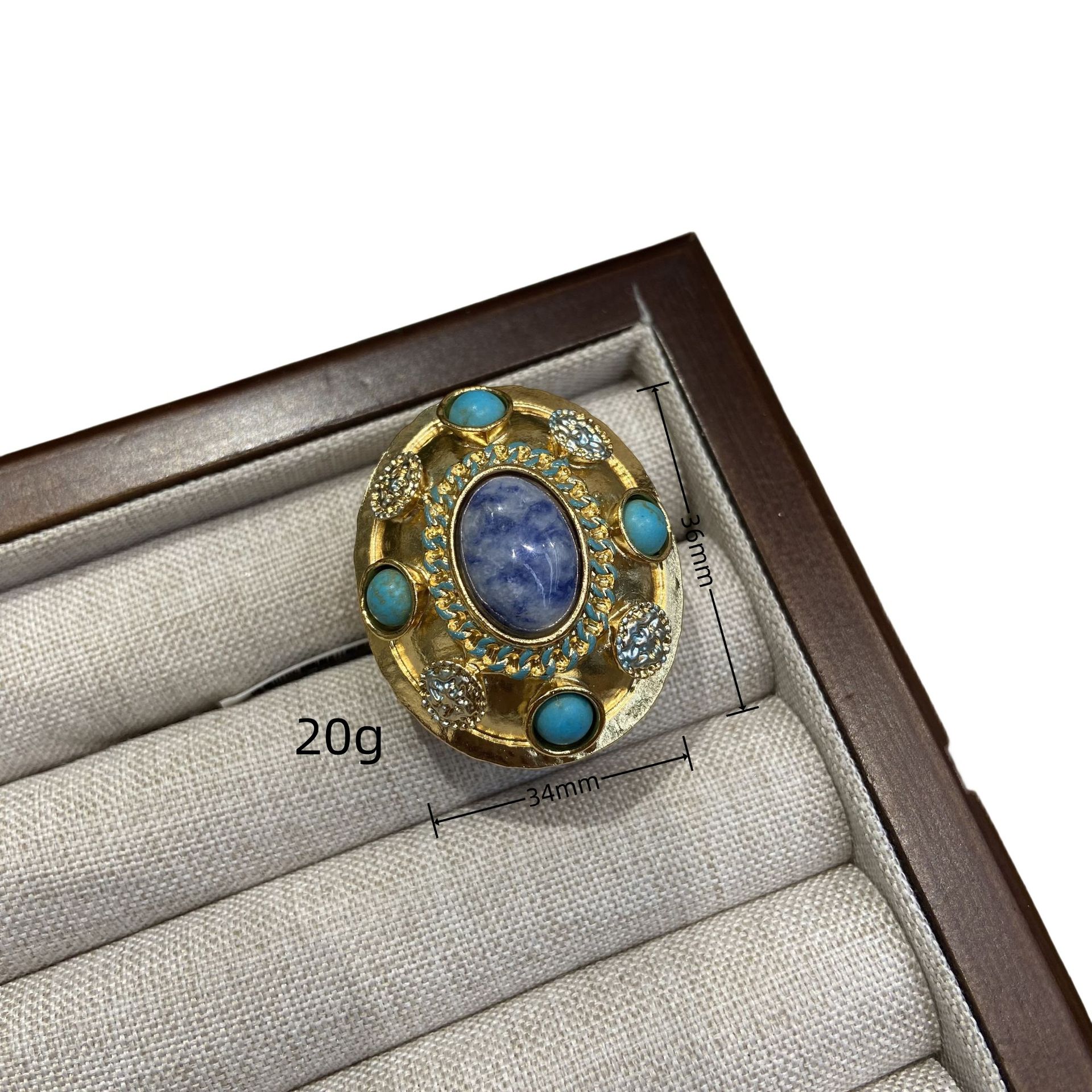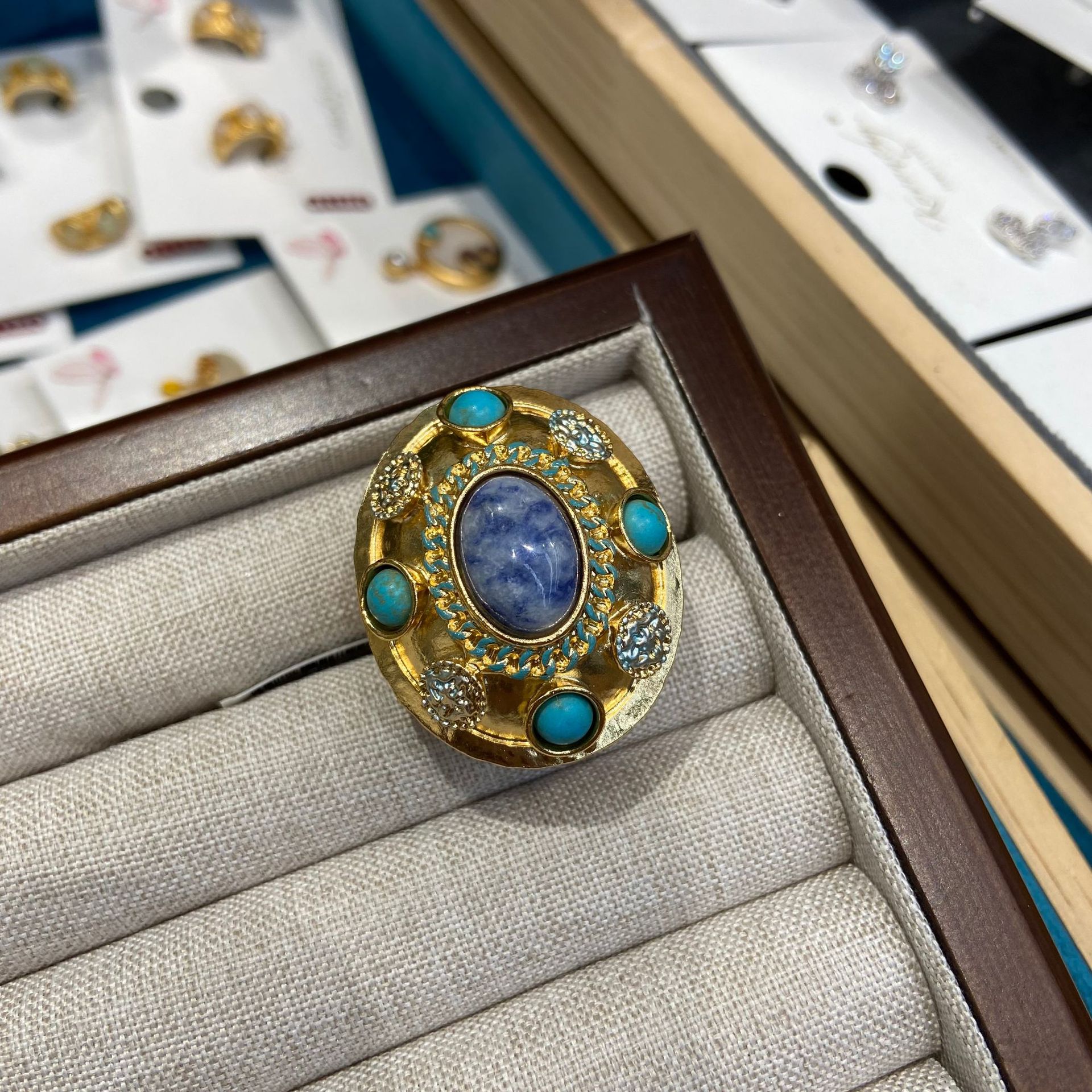 2025 New Gold Inlaid Natural Lapis Lazuli Aquamarine Sunstone Through-Hole Beaded Accessories Open Ring for Women High-End