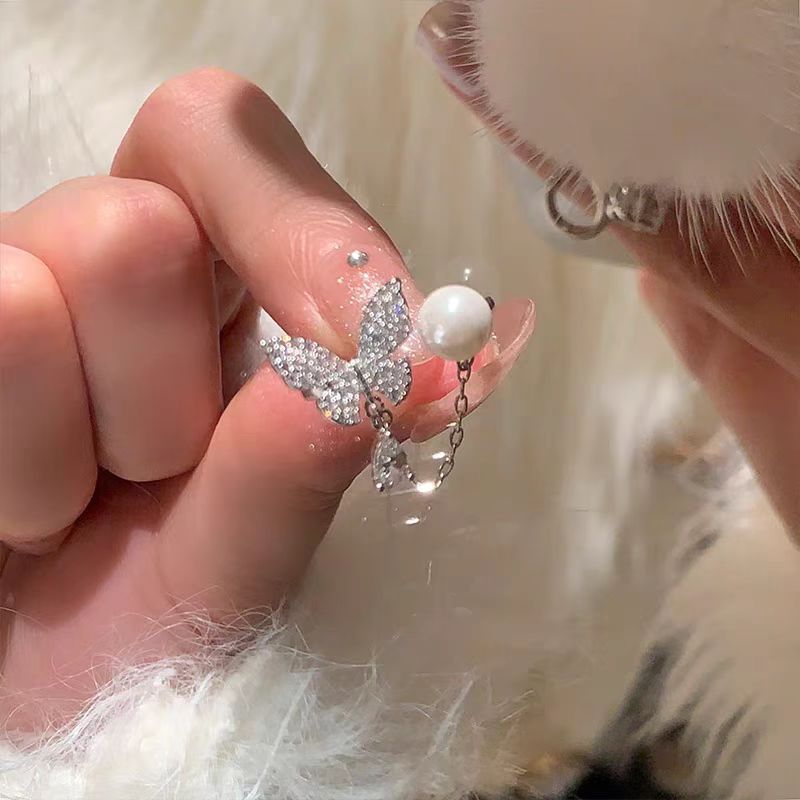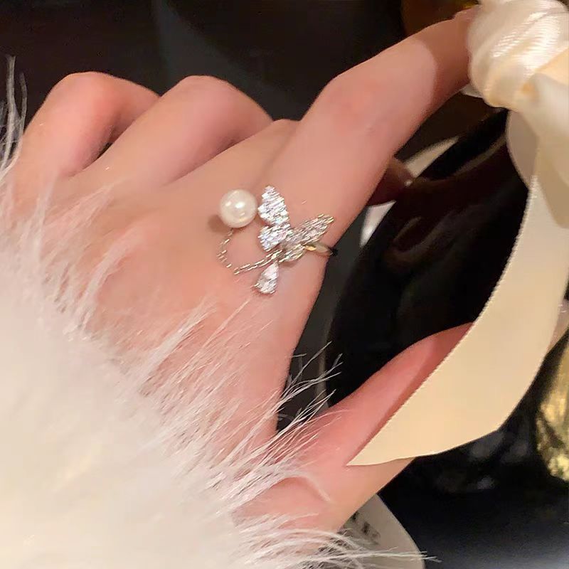 Light Luxury Super Flash Diamond Butterfly Tassel Pearl Ring Niche Design Exquisite Style Elegant All-match Ring Jewelry