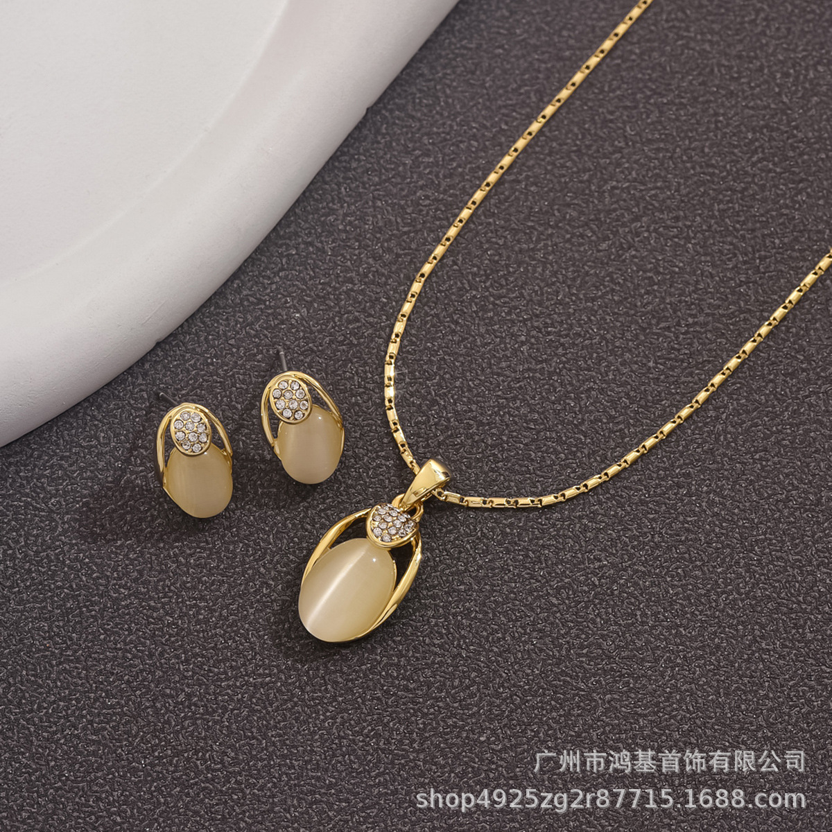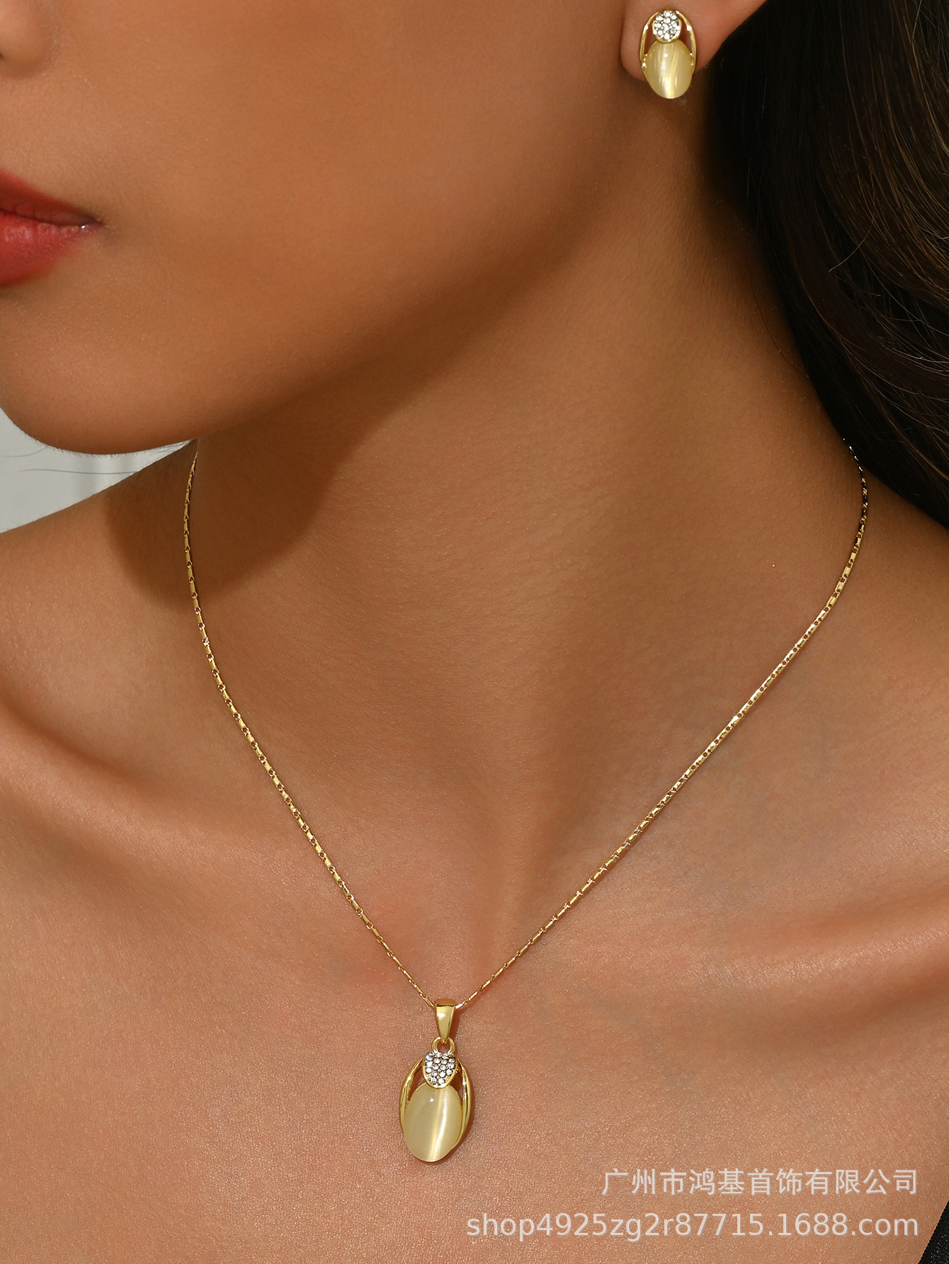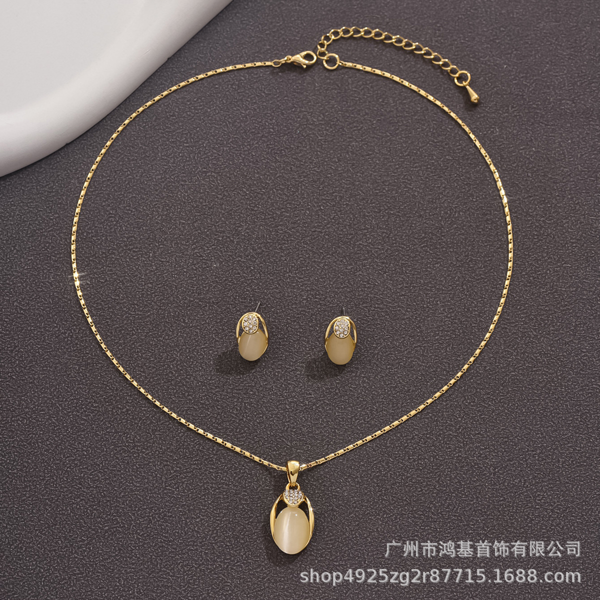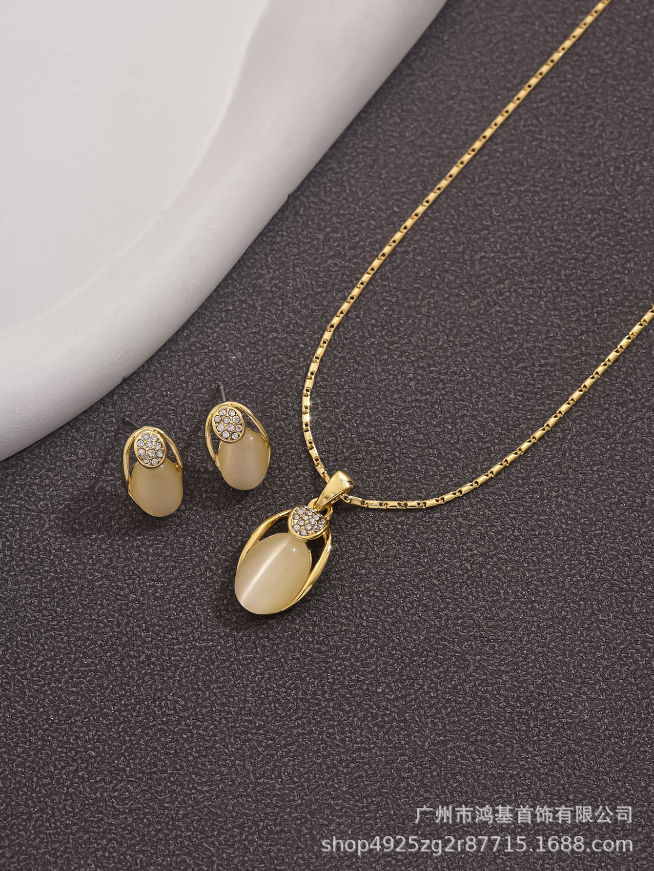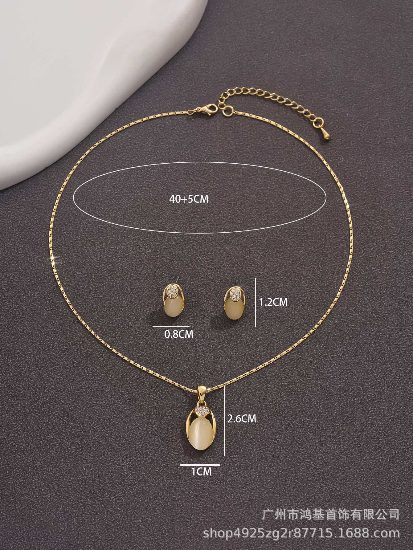Individually Packaged White Cat's Eye Real Gold Chain Women's Pendant Earring Set Gold Necklace Gift New Style