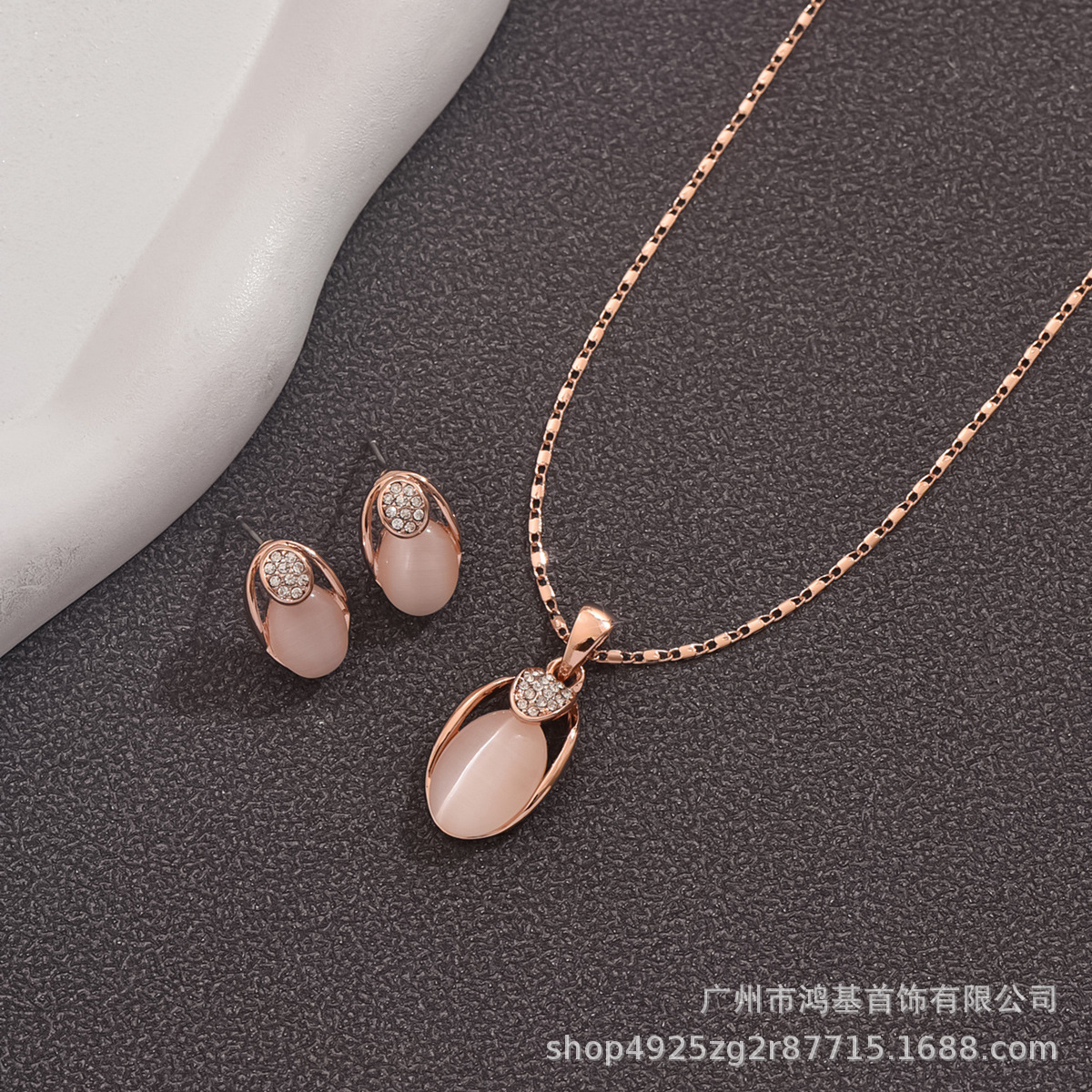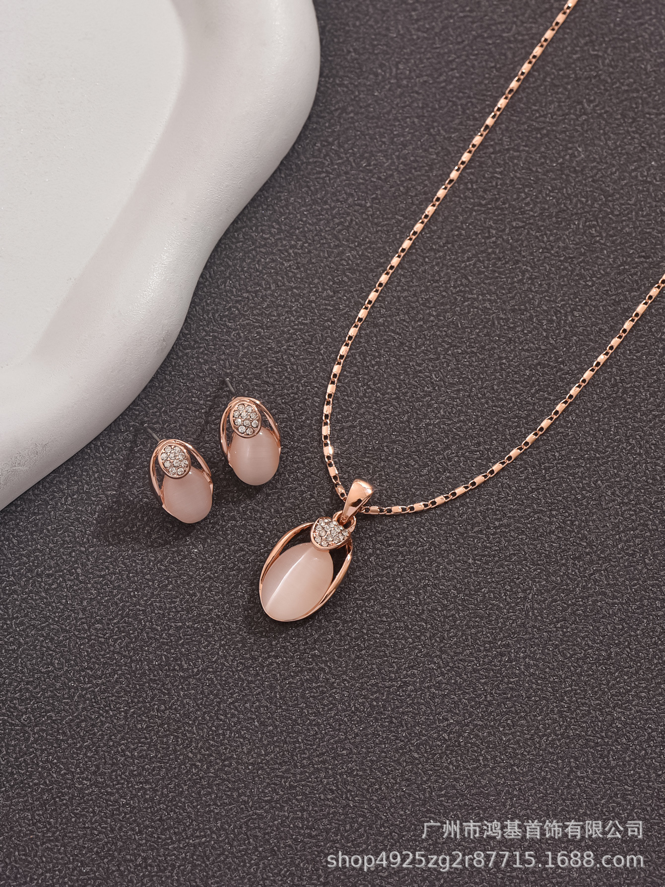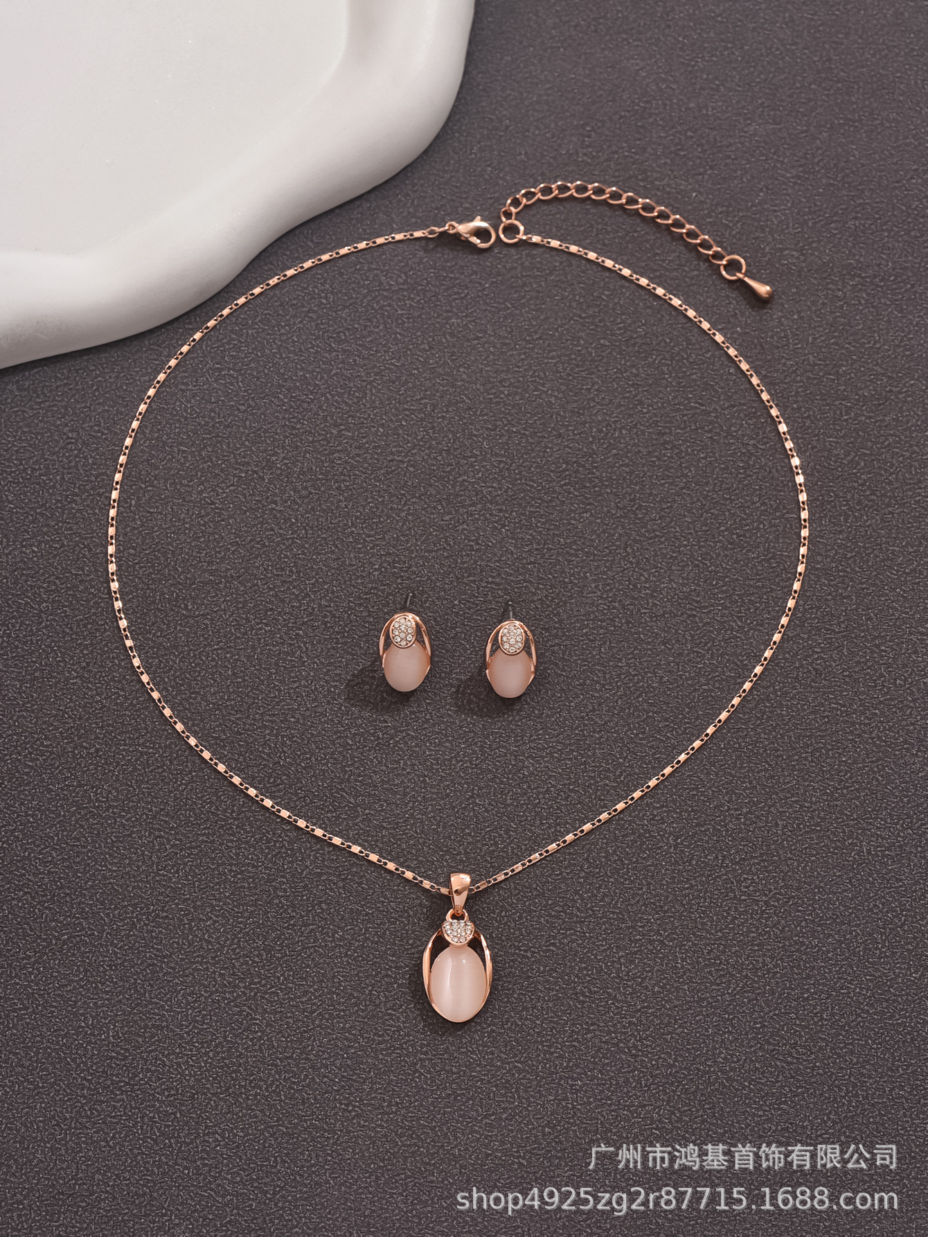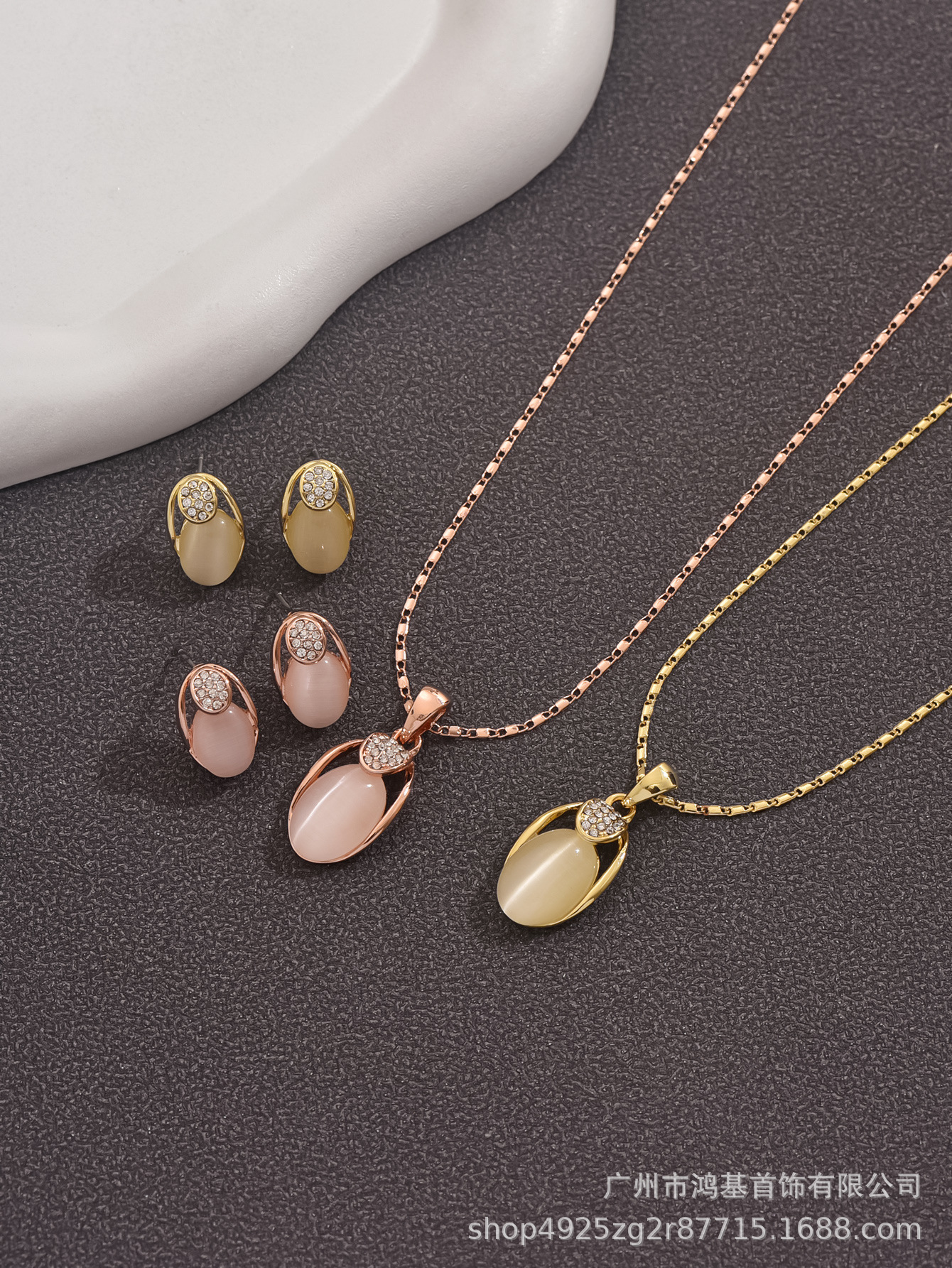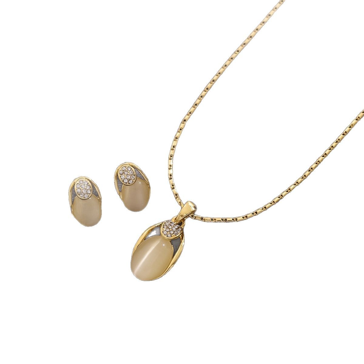 Individually Packaged White Cat's Eye Real Gold Chain Women's Pendant Earring Set Gold Necklace Gift New Style
