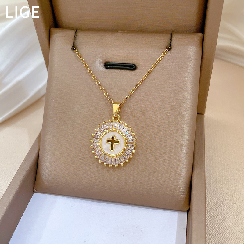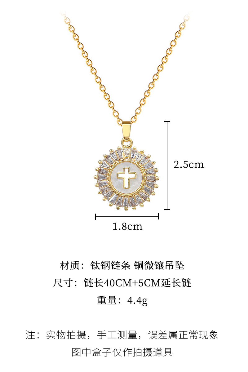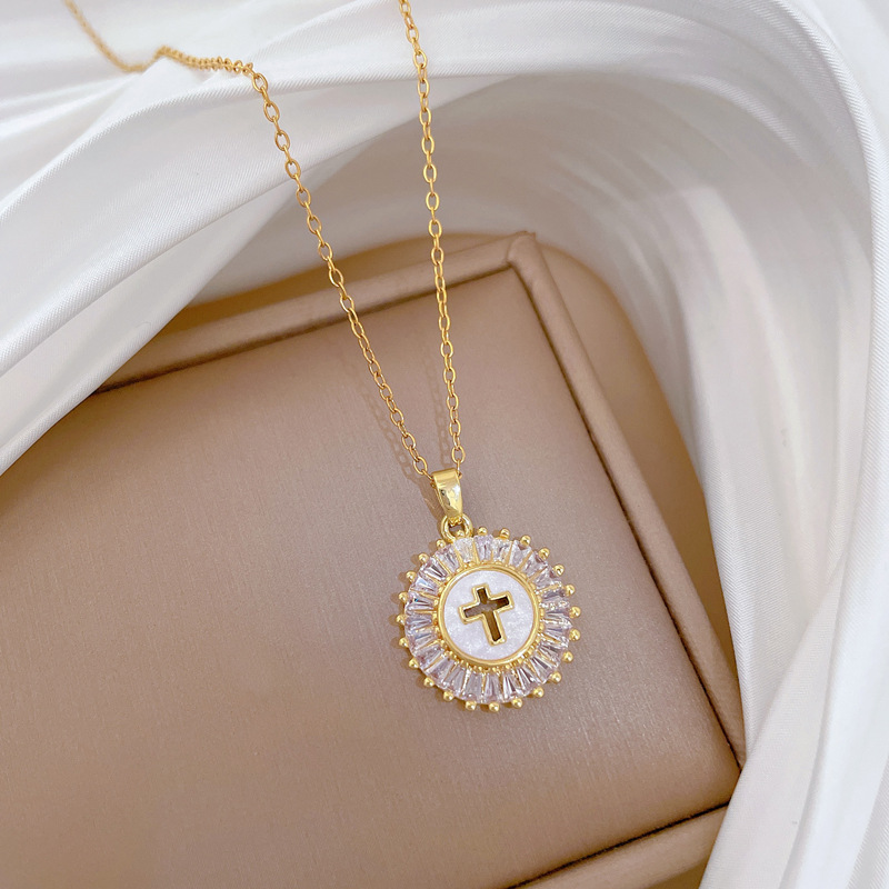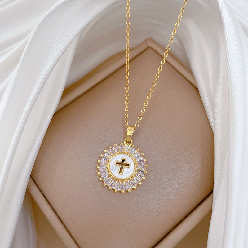 [Titanium Steel] Round Cross Light Luxury Elegant Gorgeous Diamond Necklace Women's All-match Clavicle Chain Titanium Steel Chain