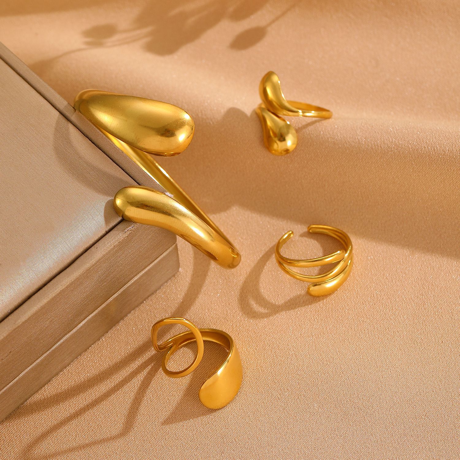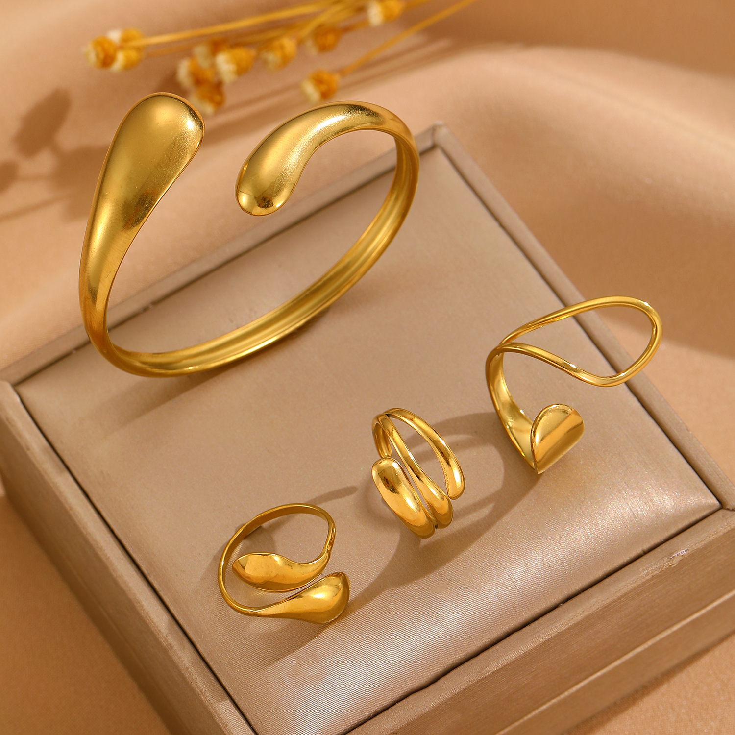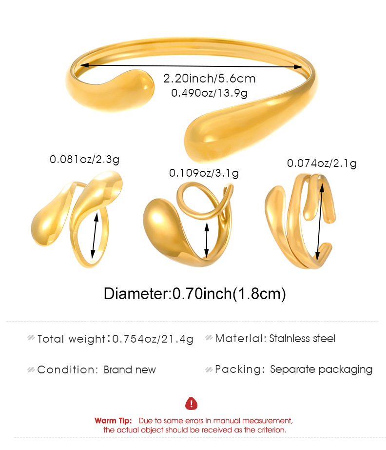 European and American Style 18K Real Gold Stainless Steel Bracelet Ring French Accessible Luxury Water Drop Open Bracelet Ring Set Decoration