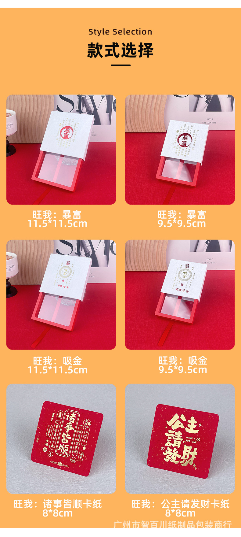 Specifications and models: Money likes me/hot matte gold + red suspended inner box; 9.5*9.5*2cm