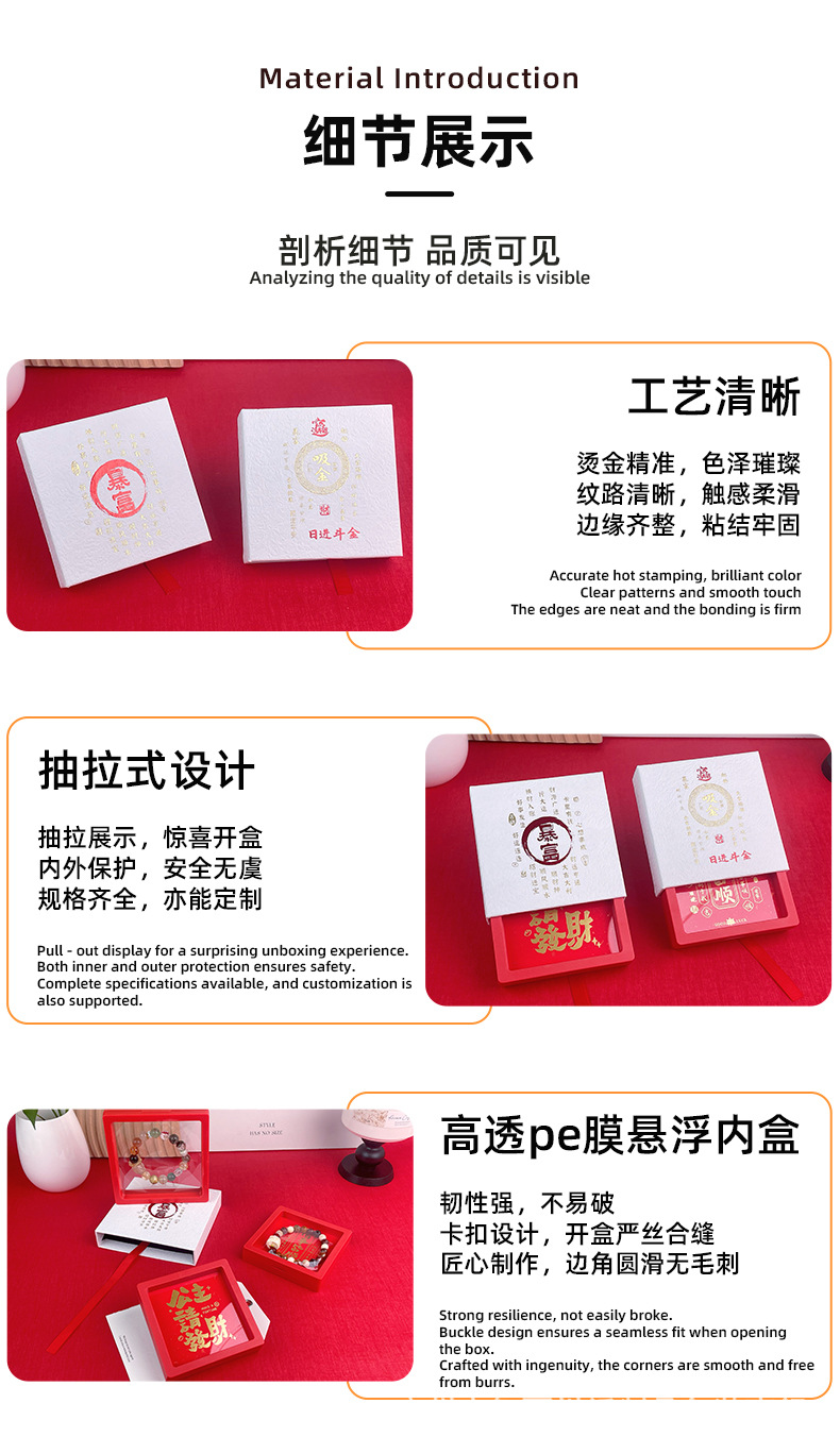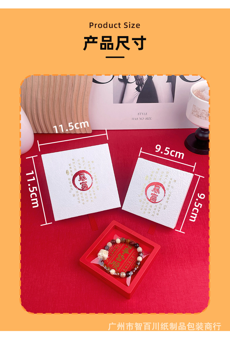 Specifications and models: Rich/red hot stamping + hot matte gold + red suspended inner box; 9.5*9.5*2cm