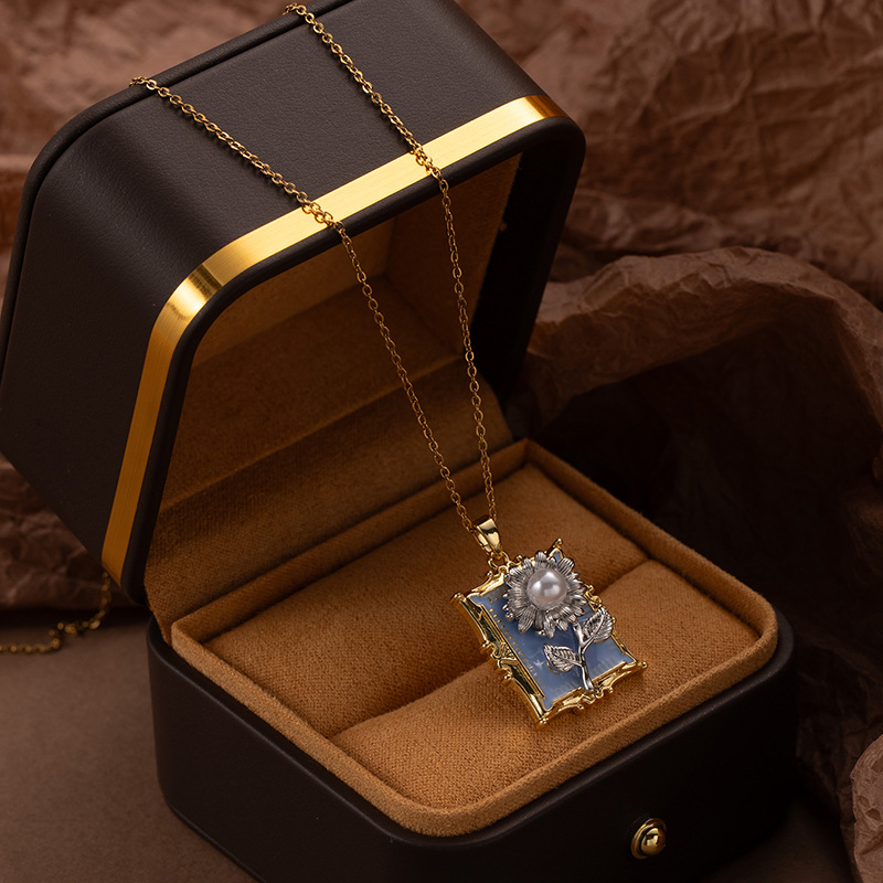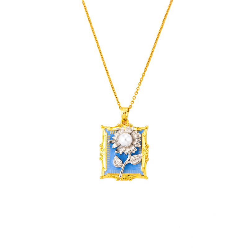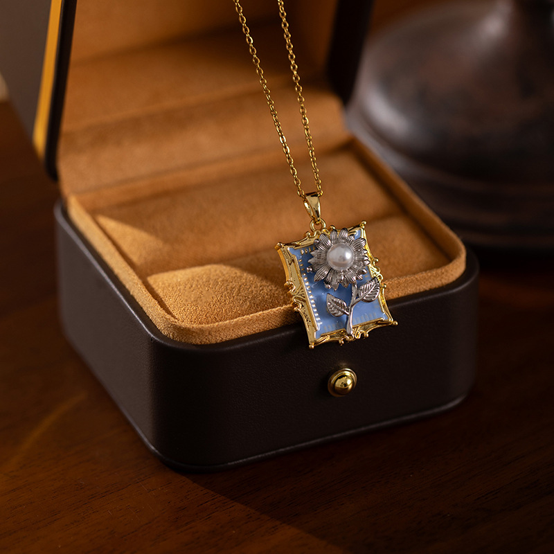 European and American Cross-border Retro Sunflower Oil Painting Necklace Female Flower Imitation Pearl Pendant suit Blue Niche Jewelry