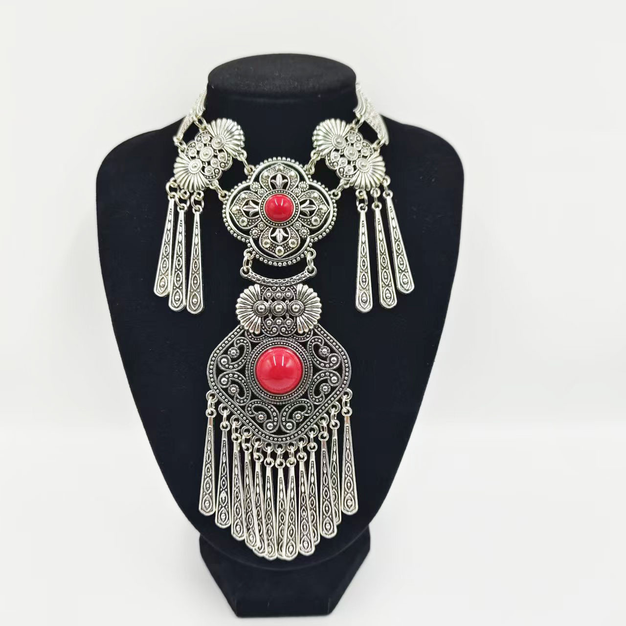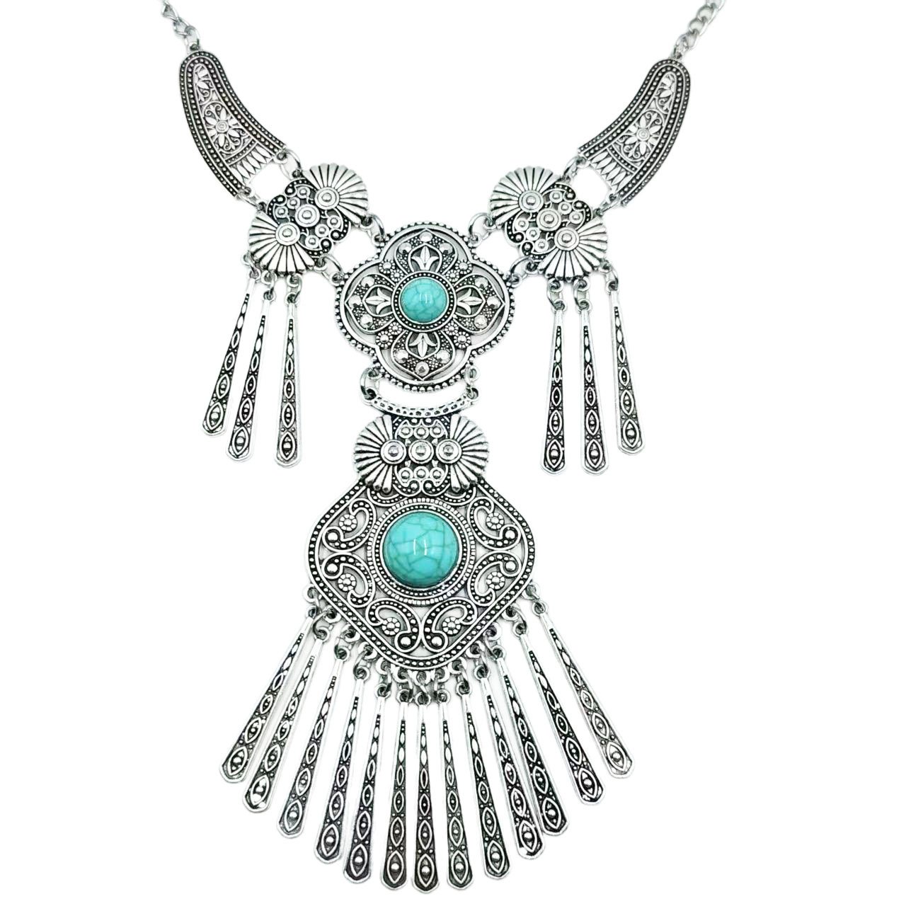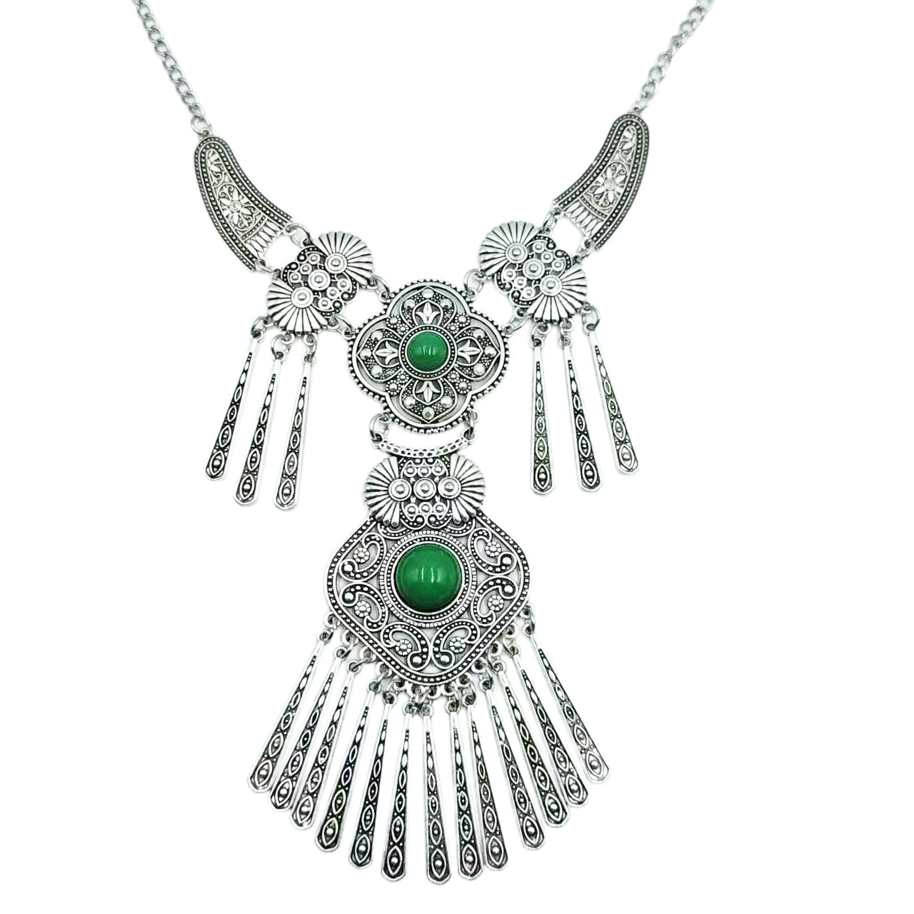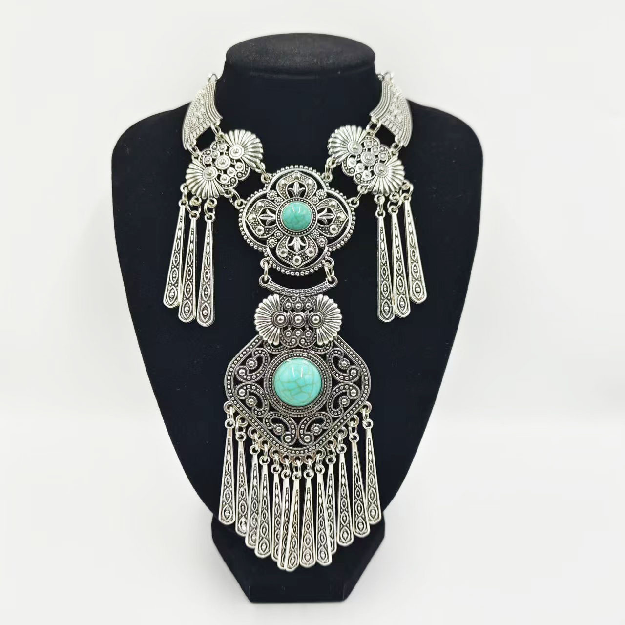 European and American Hot-Selling Bohemian Ethnic Style Necklace Alloy Retro Imitation Turquoise Leaf Tassel Pendant Sweater Chain