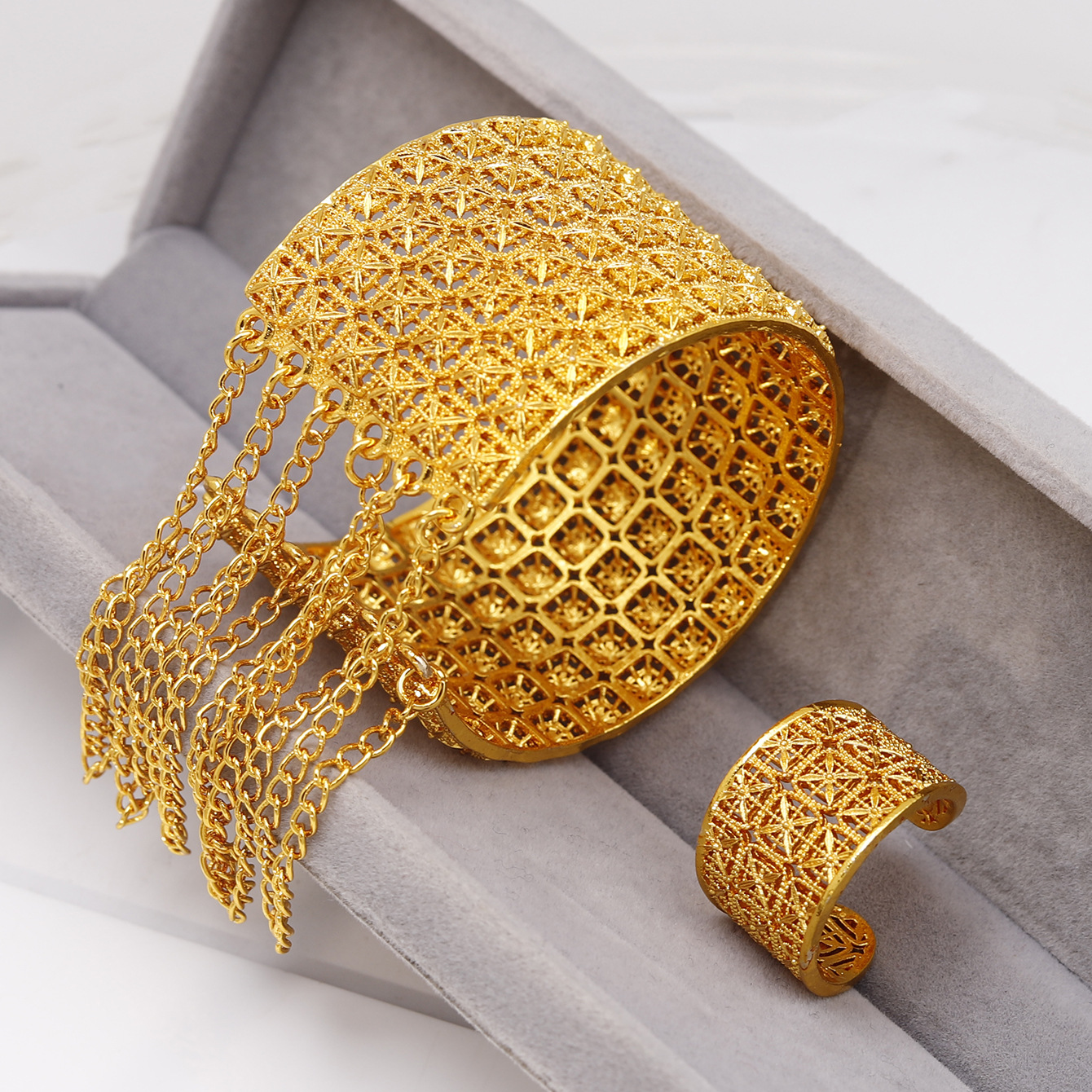 Cross-Border Middle East 24K Gold Plated Cut Out Bracelet Ring Set Dubai European and American Ladies Bridal Wedding Jewelry
