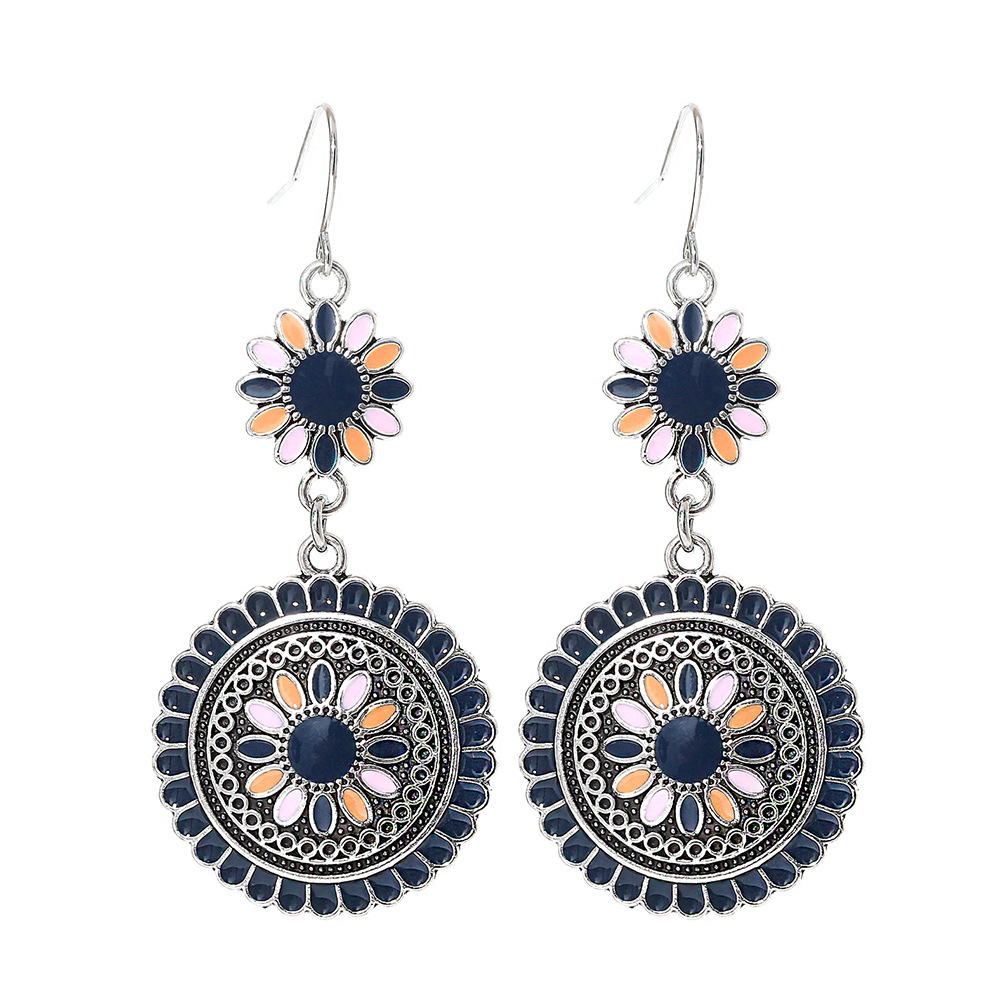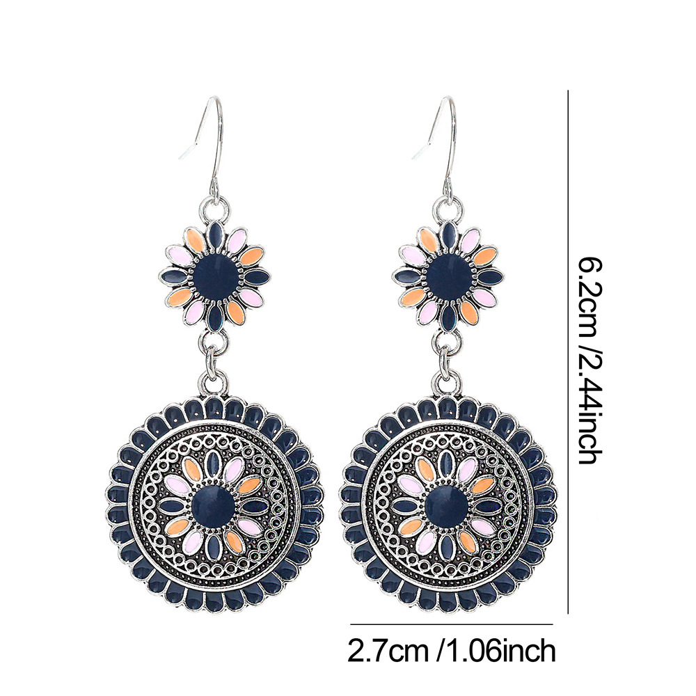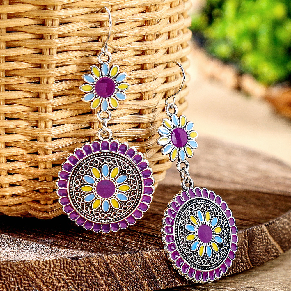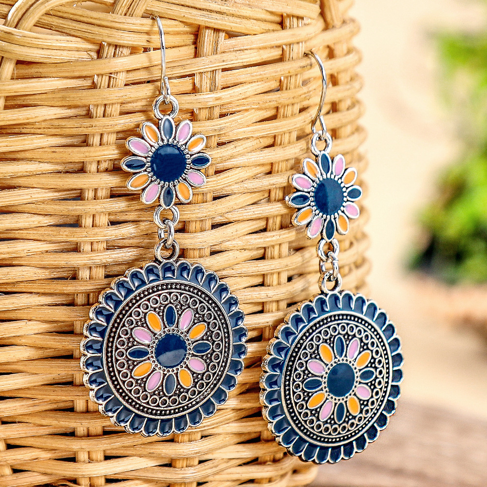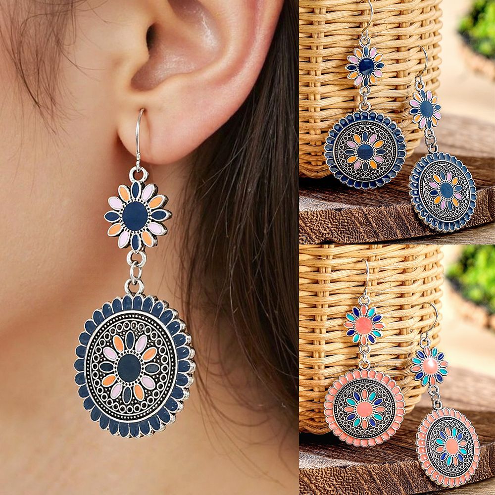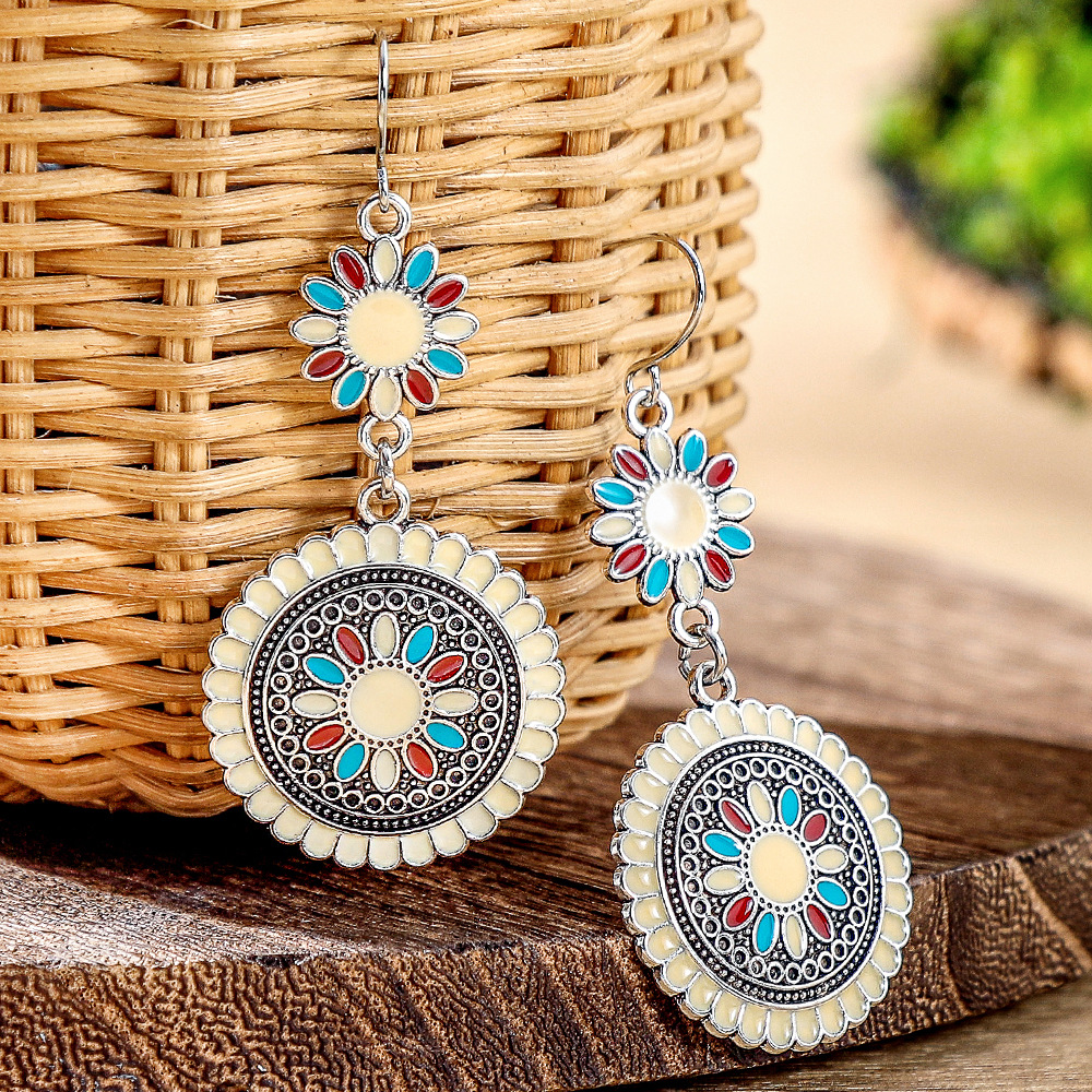 European and American Exaggerated Bohemian Earrings for Women, Oil-Dropping Round Sunflower Earrings, Yunnan Travel Ethnic Style Accessories